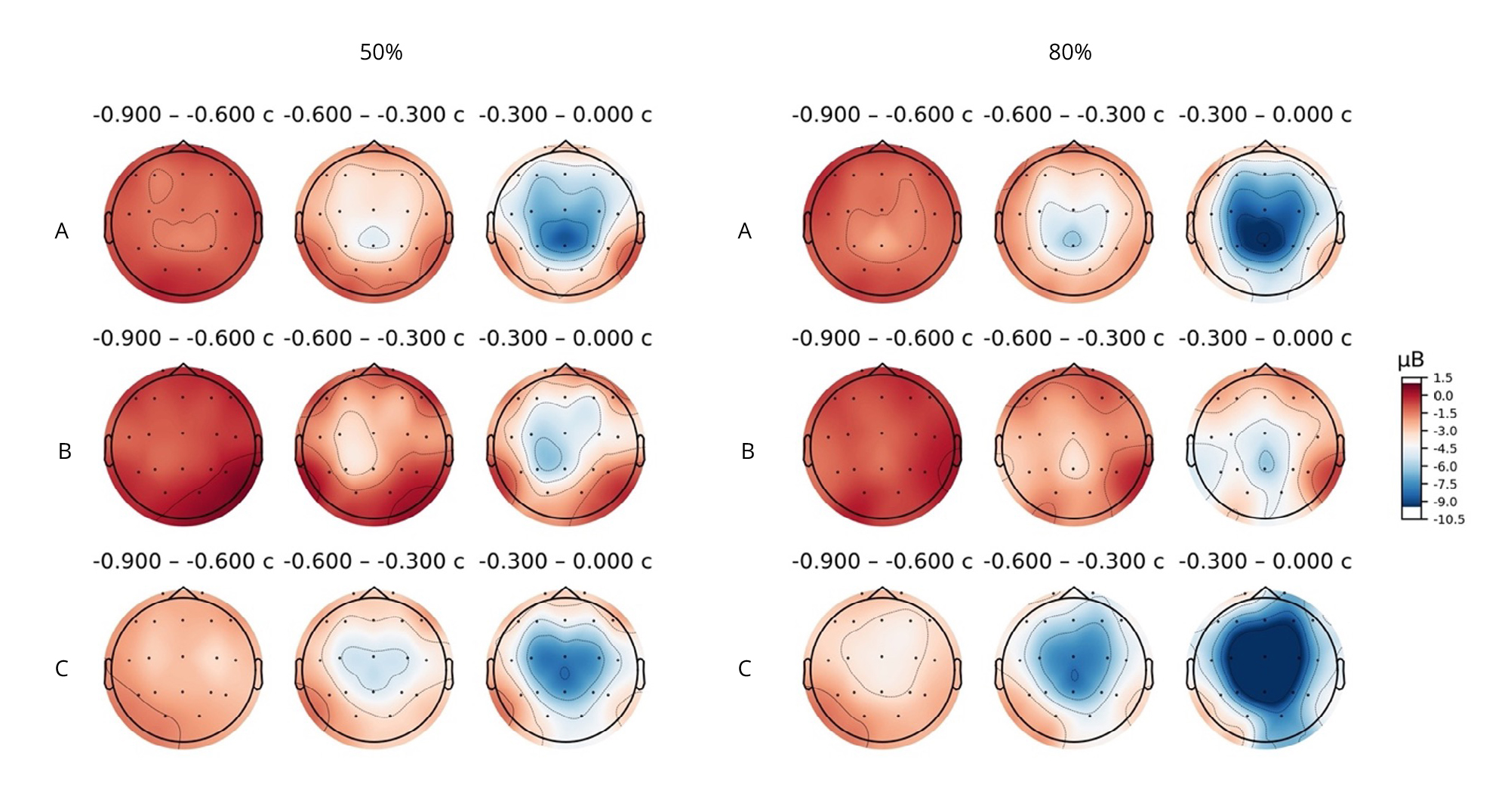Note: The left column represents the 50% probability condition, and the right column represents the 80% probability condition. Averaged amplitudes for the specified time intervals are shown. A — control group; B — first schizophrenia subgroup (CNV amplitude was higher in the 50% condition than in the 80% condition, or showed no difference between the two conditions); C — second schizophrenia subgroup (CNV amplitude was higher in the 80% condition versus the 50% condition).