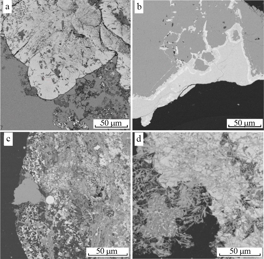 Fig. 1. Relationships of manganese minerals in aggregates (а, b): a — rhodochrosite (light gray) calcite (gray), b — rhodochrosite (light gray), manganocalcite (gray), psilomelane (white), c — polymineral chlorite–rhodochrosite–manganocalcite aggregate; d — polymineral aggregate of essentially rhodochrosite composition (right), aggregate of rhodochrosite-chlorite composition (left). SEM