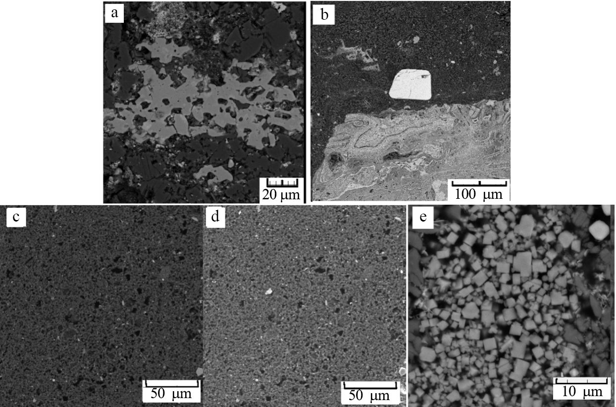 Бемит присутствует в основном в виде тонкодисперсных агрегатов, не всегда имеющих четкие границы, сформированных плотно упакованными зернами пластинчатой формы. В тесной ассоциации с бемитом обычно встречается диаспор, индивиды которого имеют таблитчатую, пластинчатую или неправильную формы. Значительно реже в таких агрегатах методом рентгенографического анализа идентифицируется гиббсит. В тесной ассоциации с минералами алюминия встречаются минералы железа (гетит, гидрогетит и гематит), отличающиеся, как правило, различной формой минеральных зерен и агрегатов (рис. 2, a, b), что в значительной степени усложняет текстурный рисунок в целом. Интересной особенностью полиминеральных существенно бемитовых агрегатов является сочетание микростроения формирующих их минералов: листоватого, чешуйчатого, тонкопластинчатого, лучистого, ажурного, концентрически-зонального (рис. 2, c–e), указывающее на то, что селективно выделить конкретные минералы будет невозможно.