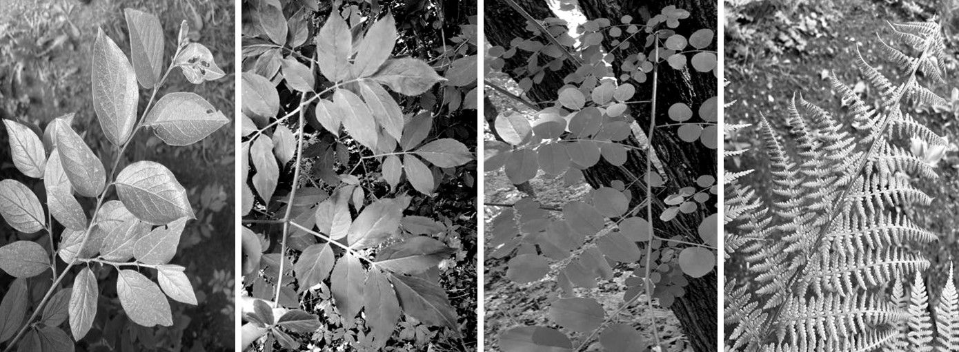 Рис. 6. Чередование типов расположения (слева направо): T* → T* - кизильник (Cotoneáster sp.), РПT → РПT - бузина чёрная (Sambúcus nigra), ПT* → [CT + РПТ] - робиния псевдоакациевая (Robinia pseudoacacia), Т* → [РПТ → ПТ* → Т*] - кочедыжник женский (Athyrium filix-femina)