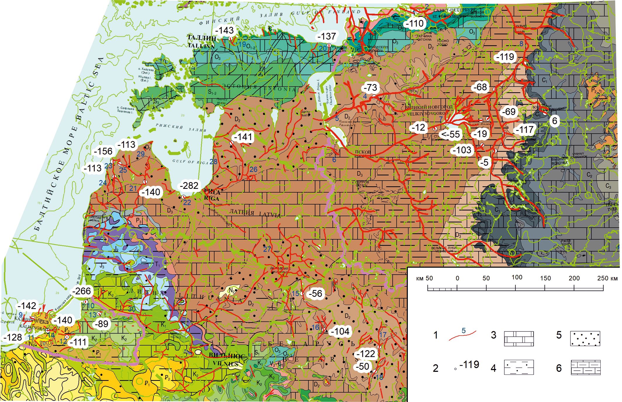 Fig. 1. Scheme of buried valleys (based on: Meirons et al., 1974; The buried..., 1976; Tavast, Raukas, 1982; Bitinas, 1999; Komarovskiy, 2009; Krotova-Putintseva, Verbitskiy, 2012; Mikhnevich, 2017; Geological map of pre-Quaternary deposits: Asch, 2005; Geological map..., 2008): 1 — buried valleys, 2 — altitude of the sub-Quaternary surface (m); 3 — carbonate rocks; 4 — clay, silt, aleurolite; 5 — sand, sandstones; 6 — interstratifying of carbonate and sandy-argillaceous rocks. Buried valleys (name or location) number: 1 — St. Petersburg, Vasilievskiy island; 2 — St. Petersburg, Muzhestva square — Lisiy Nos vil.; 3 — Luga; 4 — Pliussa; 5 — Zhelcha; 6 — Izborsk-Maly; 7 — buried valleys system of the Ilmen depression; 8 — buried valleys system of the Carboniferous plateau; 9 — Yantarniy vil.; 10 — Mysovka vil.; 11 — Baltiysk; 12 — Ozerki vil.; 13 — Slavsk; 14 — Kaliningrad; 15 — Braslav; 16 — Glubokoe; 17 — Chashniky; 18 — Selyava; 19 — buried valleys system of Tallinn; 20 — Vasavere; 21 — Talsy; 22 — Jurmala; 23 — pra-Venta; 24 — pra-Uzhava; 25 — pra-Rinda; 26 — pra-Gauya; 27 — buried valleys system of Daugava; 28 — Vidalskaya; 29 — Vitrupe, 30 — pra-Neman