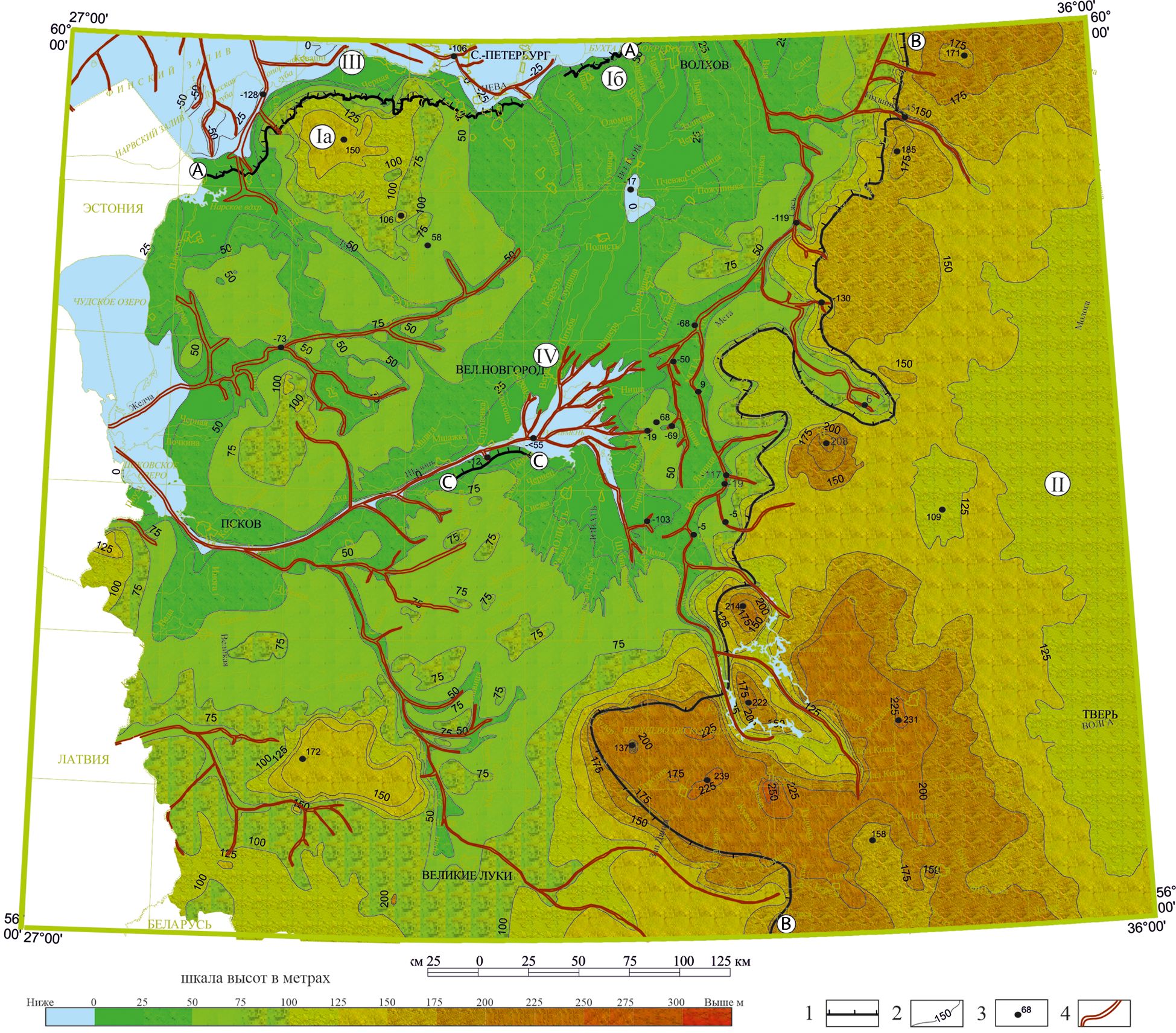 Рис. 3. Схема рельефа дочетвертичных образований (Krotova-Putintseva, Verbitskiy, 2012). Основные элементы рельефа: денудационные плато: I — Ордовикское (Iа — Ижорское, Iб — Волховское), II — Карбоновое; денудационные низины: III — Кембрийская, IV — Девонская. 1 — денудационные уступы и склоны (A-A — Балтийско-Ладожский (Ордовикский); B-B — Валдайско-Онежский (Карбоновый); C-C — Ильменский); 2 — изогипсы поверхности дочетвертичных образований, м; 3 — абсолютные отметки поверхности дочетвертичных образований; 4 — погребенные долины