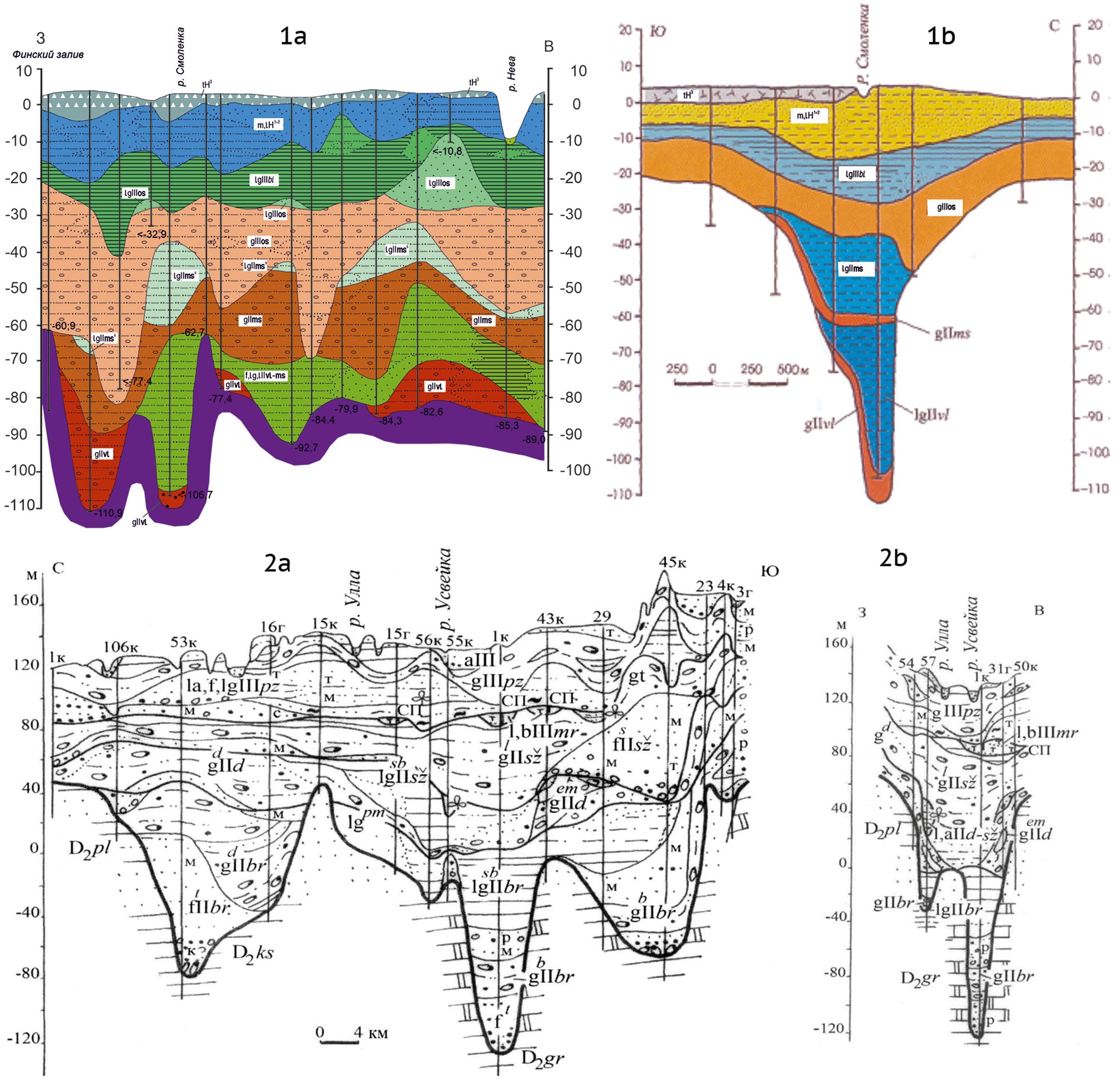 Долины Кембрийской низины заполнены ледниковыми, водно-ледниковыми и ледниково-озерными образованиями вологодского, московского и поздневалдайского оледенений. Вологодская морена выделяется условно по положению в разрезе как вторая морена под микулинскими образованиями. Аллювиальные образования в долинах Балтийско-Ладожской низины и в целом на изучаемой территории достоверно не установлены, поскольку характерными признаками погребенного аллювия равнинных рек являются сочетание основных фаций аллювия, укрупнение гранулометрического состава русловых осадков книзу, косая слоистость, постепенное уменьшение абсолютных отметок подошвы аллювия в направлении к базису эроз (Горецкий, 1974). В изученных разрезах не были выявлены линзы старичных глин с органикой; также нехарактерным для погребенных речных долин является их крайне неровный продольный профиль (рис. 4, врезки 1а, 2а).