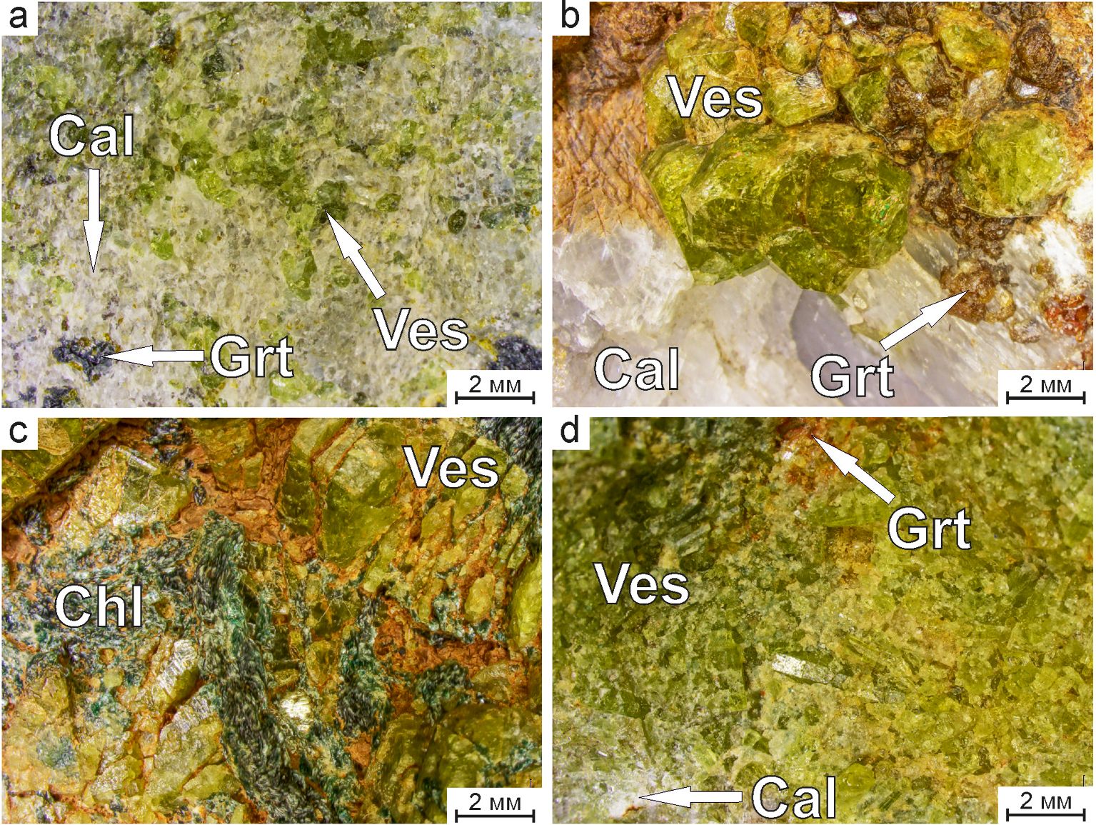 Fig. 2. Minerals of the vesuvianite group in different mineral associations (mines): a — with garnet and calcite (Zelentsovskaya); b — with garnet and calcite (Nikolaje-Maximilianovskaya); c — with clinochlor (Akhmatovskaya); d — with calcite and garnet (Shishimskaya). Abbreviations of minerals: Cal — calcite; Chl — chlorite (clinochlor); Grt — garnet of andradite-grossular series