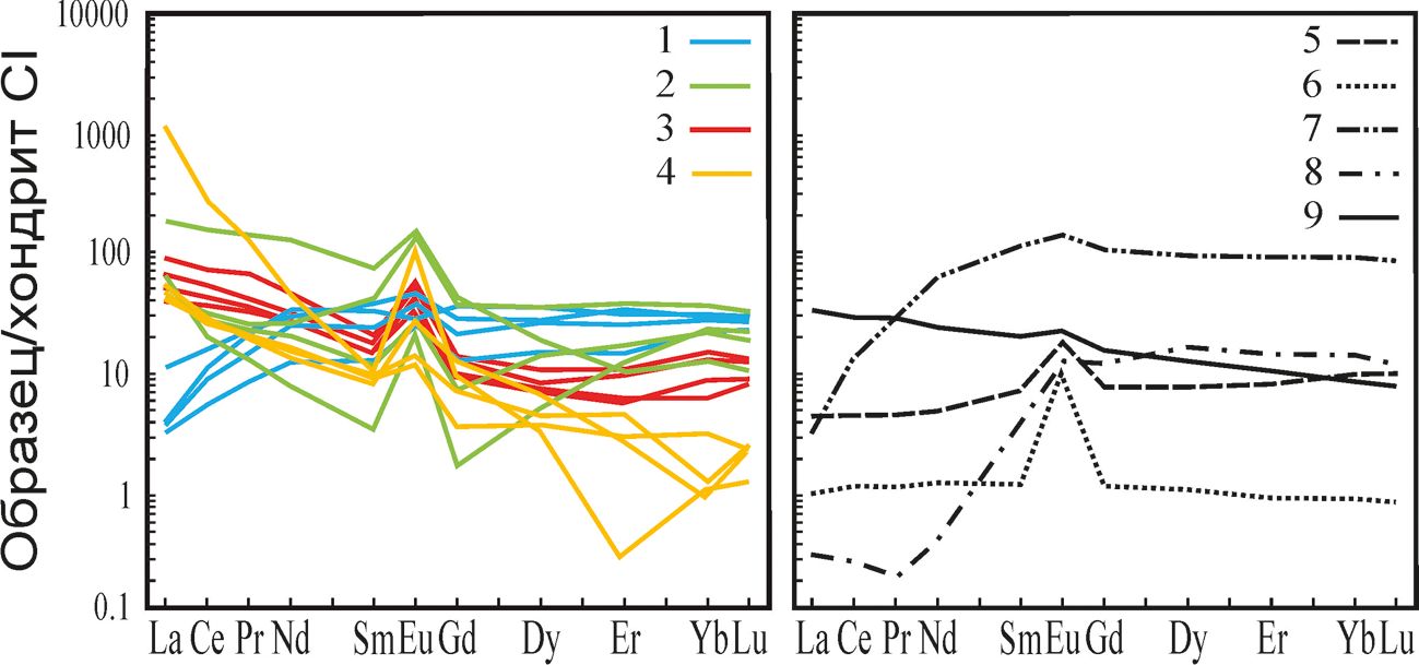 Рис. 6. Спектры распределения редкоземельных элементов: 1—4 — для рассматриваемых везувианов из копей: 1 — гранат-везувианового мрамора (Зеленцовская); 2 — гранат-везувиан-кальцитовой жилы на хлоритовом сланце (Николае-Максимилиановская); 3 –родингита (Ахматовская); 4 — гранат-везувианового скарна (Шишимская); 5—6 — для везувиана из родингитов: 5 — Западных Карпат, Словакия (Butek et al., 2022); 6 — баженовского офиолитового комплекса Среднего Урала, Россия (Ерохин, 2012); 7—8 — для образцов граната (Стативко и др., 2023): 7 — из гранат-везувианового мрамора Зеленцовской копи; 8 — пироксен-гранатового скарна Николае-Максимилиановской копи; 9 — для габбро Копанского массива кусинско-копанского интрузивного комплекса (Kholodnov et al., 2018)