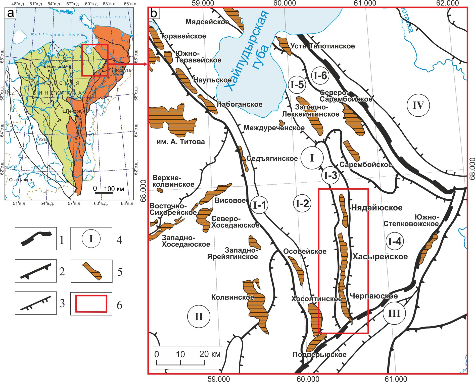 Symbols: 1–3 — boundaries of tectonic elements: 1 — superorder, 2 — first order, 3 — second order; 4 — numbers of tectonic elements: I — Varandey-Adzva structural zone (I-1 — Sorokin swell, I-2 — Morey depression, I-3 — Gamburtsev swell, I-4 — Upper Adzva depression, I-5 — Saremboy-Lekkeyaga swell, I-6 — Talota swell), II — Khoreyver depression, III — Chernyshev Ridge, IV — Korotaikha depression; 5 — oil fields; 6 — work area