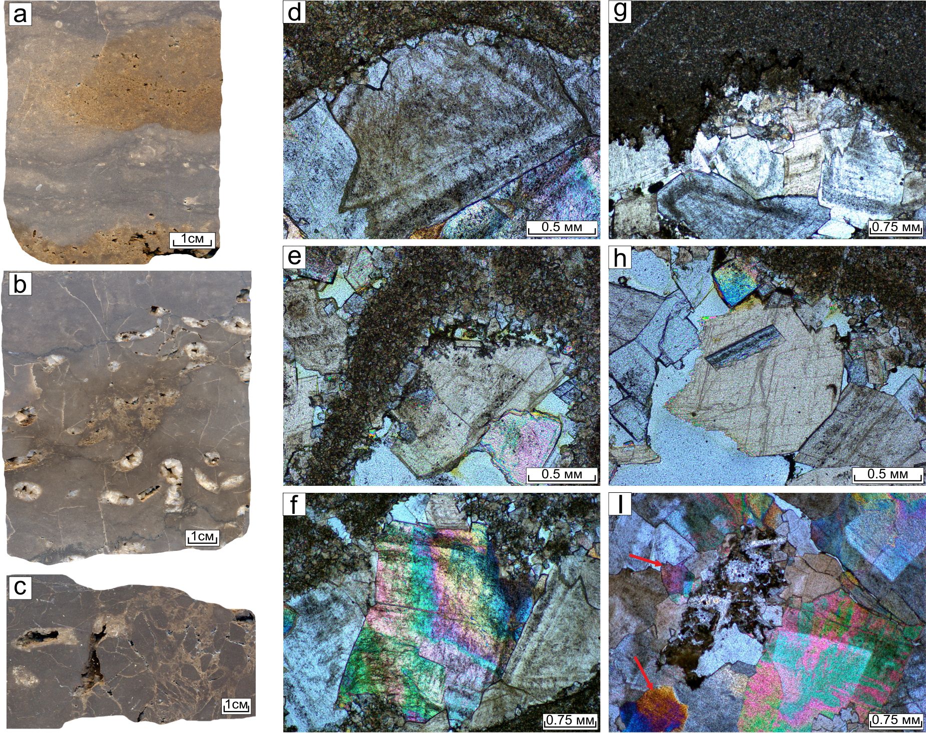 Второй тип пород-коллекторов формируют доломиты замещения отложениями нижней сублиторали. Они имеют первично известковый состав с крупными остатками колоний и раковин «рассеянных» в иловой матрице (рис. 2, b, с), относимых к отложениям нижней сублиторали. Доломитизация ила проходила относительно равномерно и привела к его замещению плотным агрегатом тонко-мелкозернистого доломита. Раковины и крупные обломки табулят, строматопорат обычно не образуют скоплений с «каркасной структурой», а погружены в иловую массу. Они преобразовывались по иным сценариям и в более поздние сроки. Их остатки либо полностью, либо частично замещены доломитом и кремнием, либо выщелочены до образования каверн, немного заполненных цементами крупнокристаллического доломита (рис. 2, d-h), иногда с кристаллами ангидрита. Аналогичные цементы заполняют также зоны дробления пород и трещины (рис. 2, i). Кристаллы доломита часто имеют зональное, подчеркнутое обилием включений, или блочное строение. Встречаются кристаллы «седловидной» формы (рис. 2, f). В ряде случаев грани кристаллов демонстрируют отчетливые следы растворения (рис. 2, e, h).