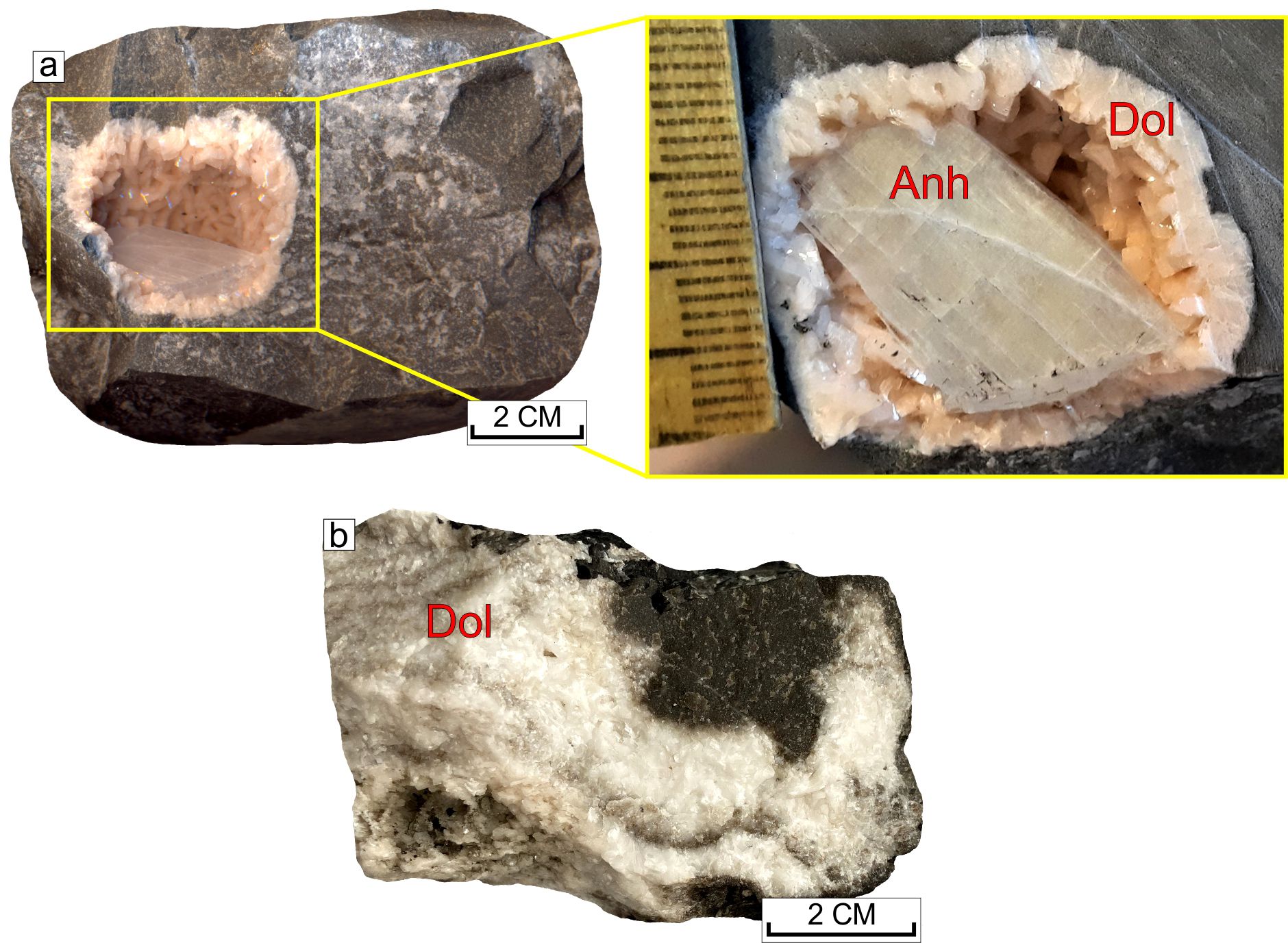 По морфологическим и геохимическим особенностям крупнозернистый ромбоэдрический или «седловидный» доломит выполнения пустот не отличается от аналогичных доломитов, описанных во многих разрезах катагенетически измененных карбонатных пород, включающих залежи углеводородов, воды древних водоносных горизонтов и рудные сульфидные месторождения типа долины Миссисипи — (MVT). Характерными признаками для них являются: послойное обогащение Fe, Mn и Ca, изменение изотопных отношений δ13С в диапазоне от слегка положительных до умеренно отрицательных значений и умеренно отрицательные значения δ18О (Warren, 2019).
