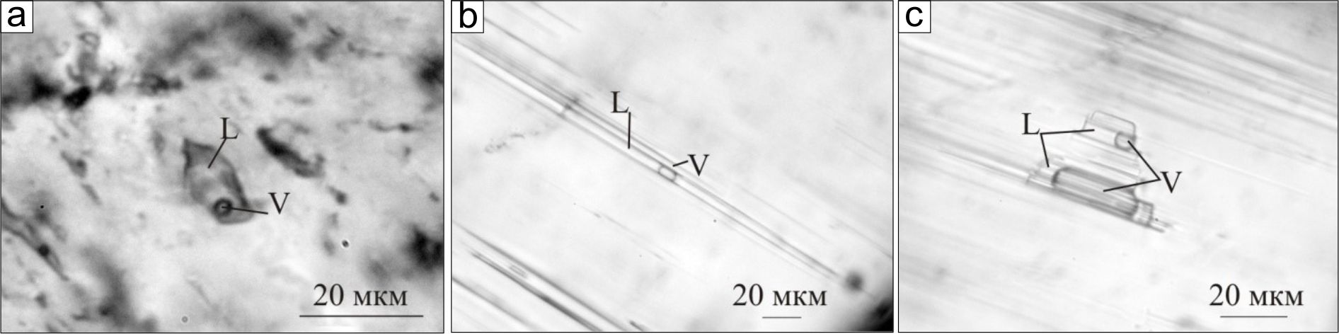 Рис. 5. Включения: a — первичные в доломите (обр. 3/3); b — первичные в ангидрите 3/3; с — гетерогенного захвата в ангидрите (обр. 3/3). V — газовая фаза, L — жидкая фаза