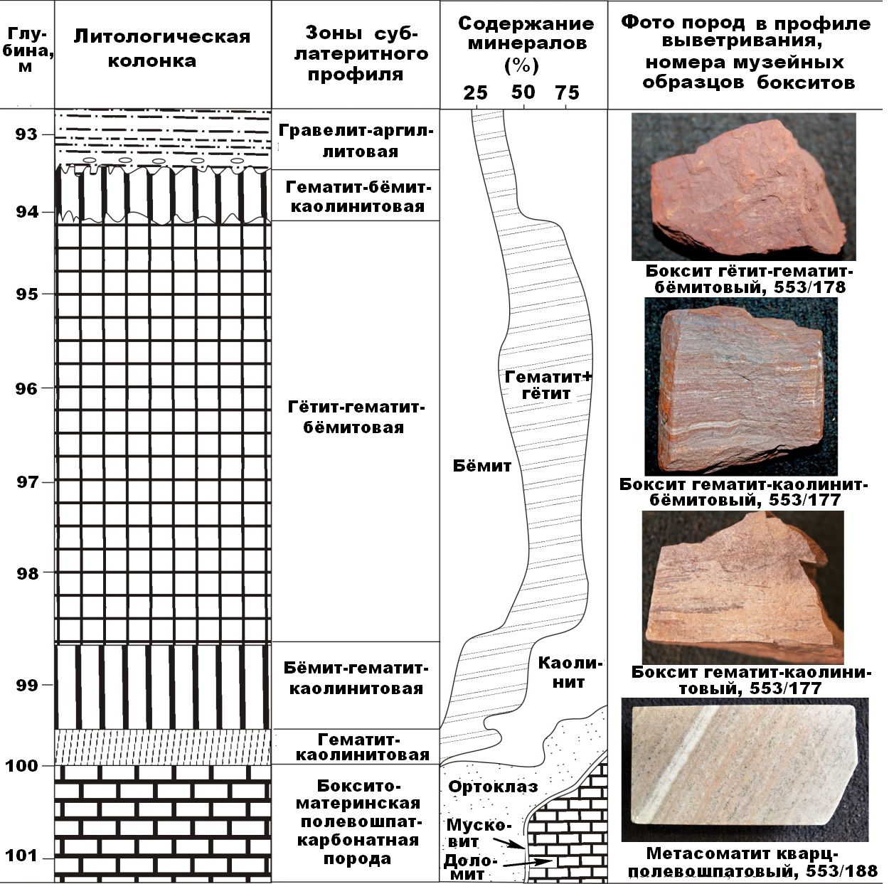 На разных площадях месторождений Среднего Тимана субстратом бокситов служили разные породы. На Вежаю-Ворыквинской и Южно-Щугорской площадях доминируют бокситы, развитые на субстрате глинистых, карбонатно-глинистых и глинисто-карбонатных сланцев, а также на переотложенных продуктах выветривания этих пород. На Верхневорыквинском месторождении бокситы развивались по туфам и частично по подстилающим туфы рифейским сланцам. На Северо-Щугорской площади установлены субмономинеральные бокситы, которые образовались за счет карбонатно-полевошпатовых метасоматитов в складчатом фундаменте (Георгиевский, и др., 2011). Стадийное изменение одного из главных в метасоматитах породообразующих минералов — полевого шпата — происходило в последовательности: полевой шпат → гидрослюда → каолинит → бемит. Кроме каолинита и бёмита в данном процессе участвуют оксиды и оксигидроксиды железа — гематит, гидрогематит, меньше гётит. Железистые бокситы подразделяются на каолинит-гематит-бёмитовые и гематит-бёмитовые (Беляев, Лихачев, Швецова, 1983). Описанная выше схема выветривания полевошпатовых метасоматитов тоже относится к латеритному типу, а связанные с нею бокситы являются остаточными продуктами гипергенеза. Направленность процесса выветривания и последовательность превращения субстратов в боксит реализуются довольно однообразно, хотя составы зон в гипергенных профилях, возникающих на различных субстратах, могут несколько различаться (Беляев, 1997).