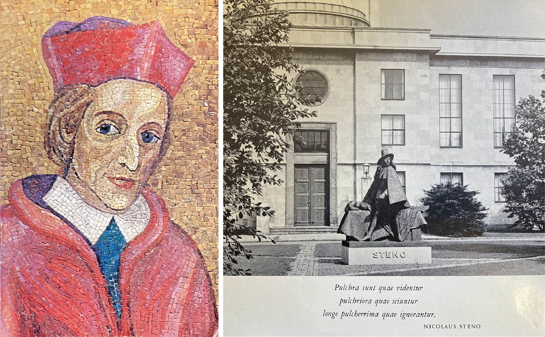 Рис. 2. Титульный цветной мозаичный портрет в больнице св. Иосифа (худ. А. Лейхбауер) и памятник Н. Стено в Копенгагене. Текст под фото: «Pulchra sunt quae videntur pulchriora quae sciuntur longe pulcherrima quae ignorantur. Nicolaus Steno» («Есть прекрасные вещи, которые мы видим, еще более прекрасные, о которых мы знаем, и самые прекрасные, которые нам неизвестны. Николай Стено» — пер. с лат. наш — Ю. В.)