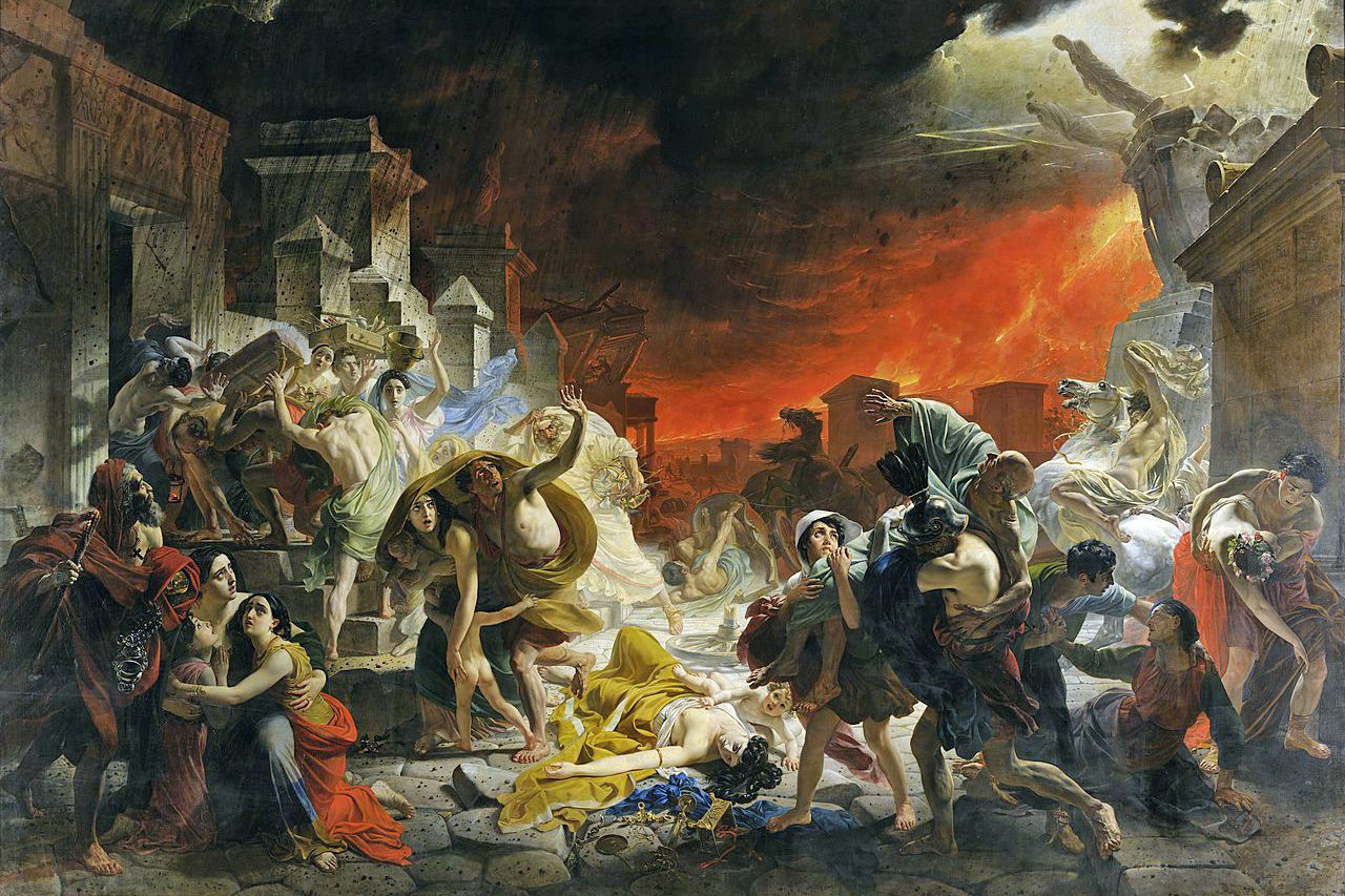 Рис. 5. Брюллов К. Последний день Помпеи. 1833. «Одни только слышимы были жалобы жен, вопль детей и крик мужей. Один звал своего отца, другой сына, иной жену, и друг друга узнавали только по голосу. Сей оплакивал свое несчастье, а тот бедствие своих родственников, а иные от страха смерти призывали самую смерть. Многие умоляли о помощи богов, многие думали и полагали, что сия ночь была самая последняя и вечная ночь, в которой свет долженствует остаться. Были же и такие, которые умножали правильный и справедливый страх воображаемыми и мечтательными ужасами» (Достопамятности..., 1800, с. 32–33)
