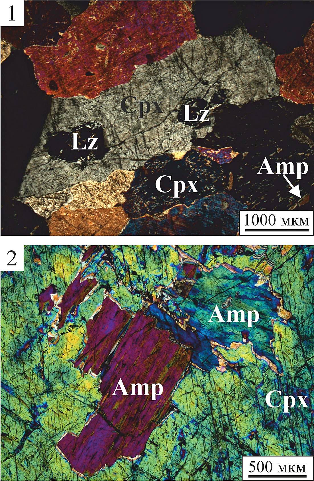 a — hadacrysts of lizardite-replaced olivine (Lz) in clinopyroxene (Cpx), partially replaced by amphibole (Amp), thin section OЯ-9; b — amphibolization of clinopyroxene, thin section OЯ-48-2. Images in transmitted light, crossed nicols