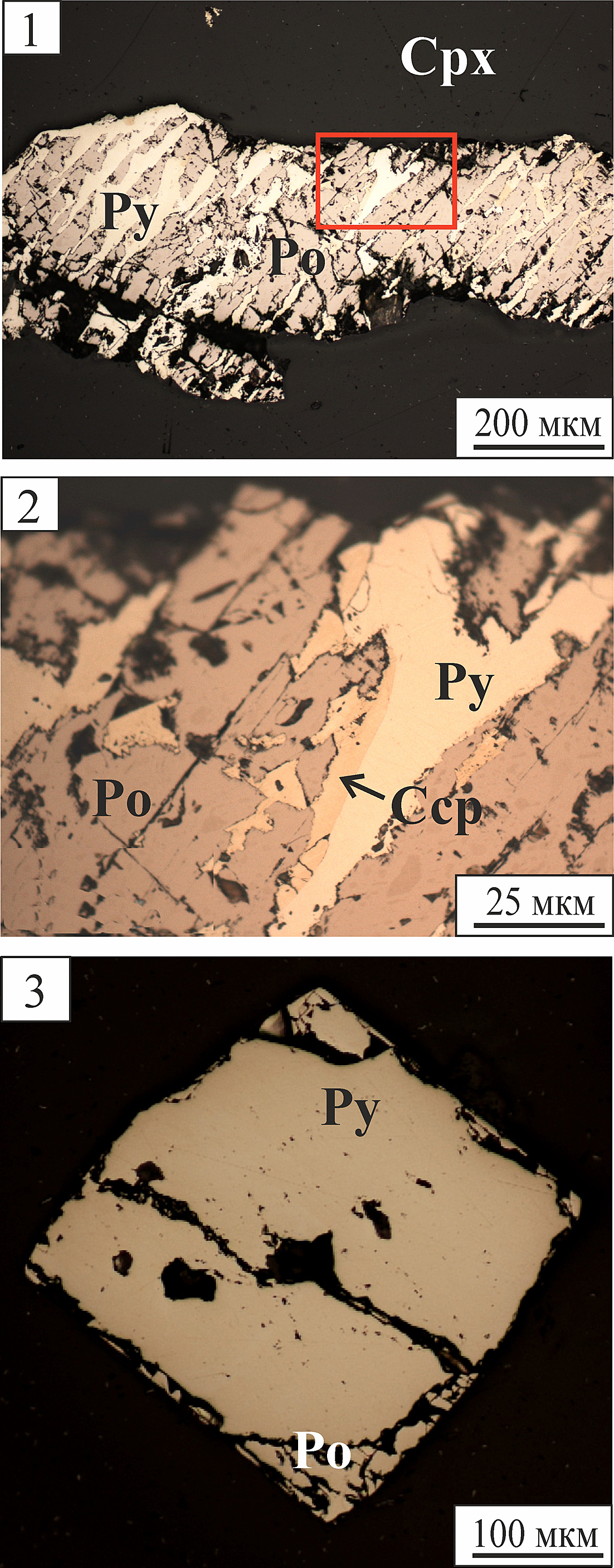 a — субпараллельное, вероятно реакционное, срастание «пирротин (Po) + халькопирит (Ccp) + пирит (Py)» (обр. 529/169); b — то же, фрагмент; c — обрастание пирротином кубического кристалла пирита (обр. 531/121.5). Оптические снимки полированных образцов в отраженном свете, николи параллельны