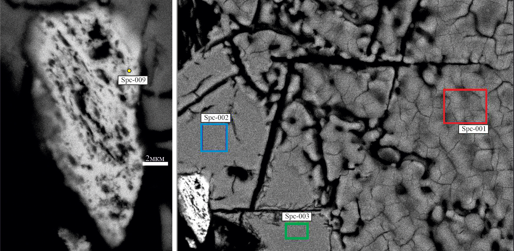 Fig. 9. Inclusion of palladium telluride (light inclusion; composition СPd ≈ СTe, most likely kotulskite) in chalcopyrite, on the left is an enlarged fragment with an image of the inclusion (OЯ-28-2)