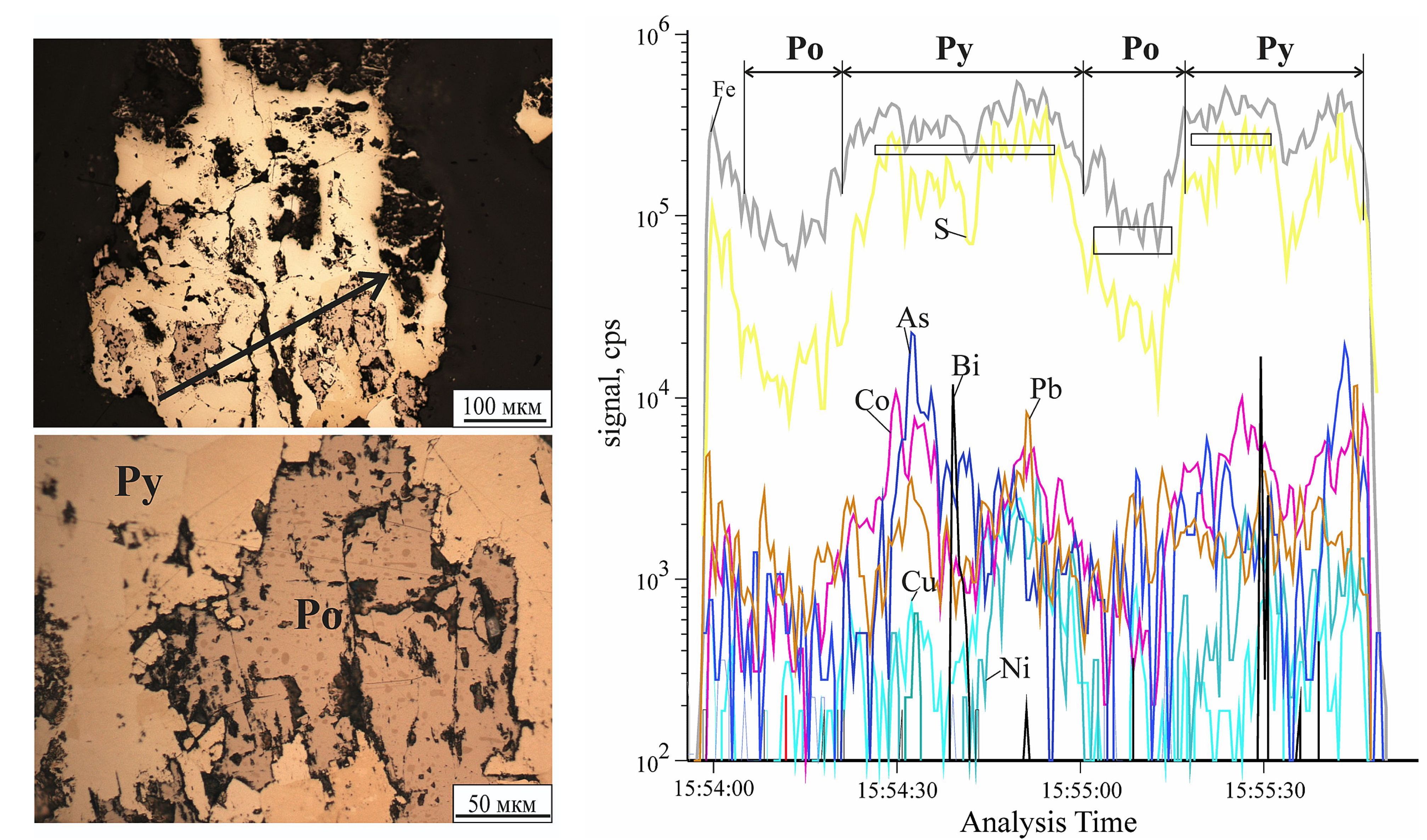 Пирротин в этой ассоциации, часто в виде пятен и каём, замещает пирит. Пики элементов-примесей Co, As, Bi, Pb тяготеют к пириту (рис. 10), а их провалы — к пирротину. Таким образом, при замещении пирита пирротином происходит высвобождение ряда примесей, которые, вероятно, в дальнейшем участвуют в процессе рудообразования.