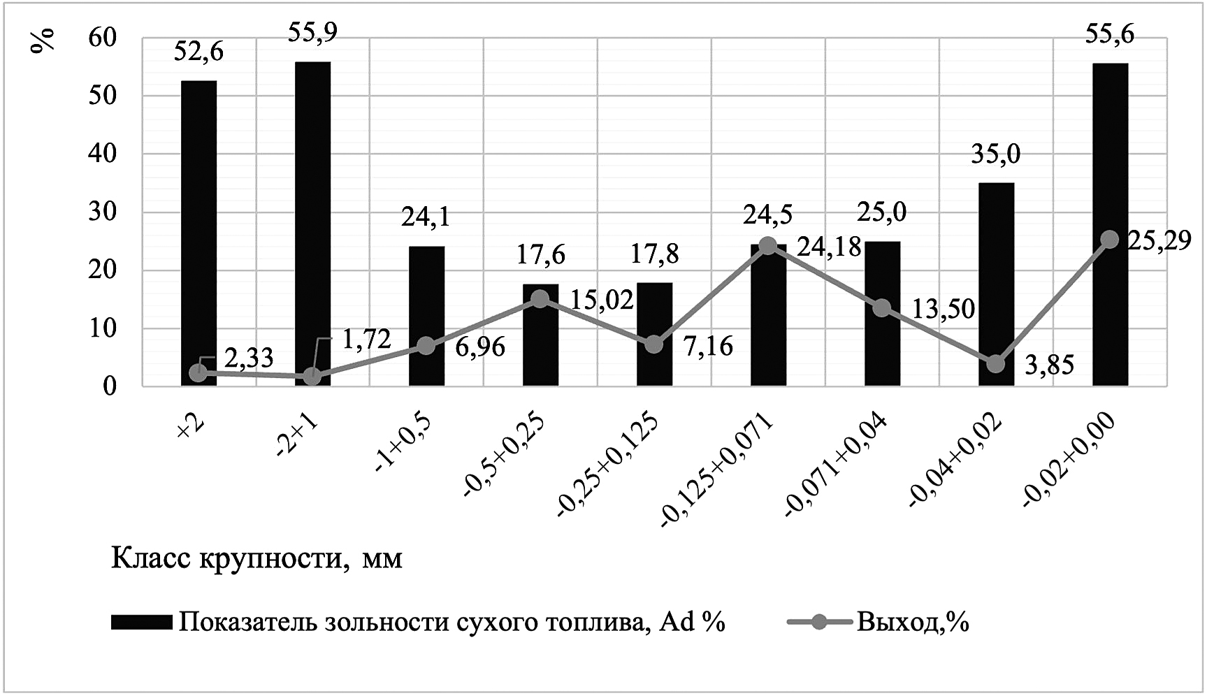 Выход тонкодисперсного материала крупностью менее 0.071 мм в исходной пробе составляет 42.64 % (рис. 1). Из них на материал менее 0.02 мм приходится 25.29 % с показателем зольности сухого (Ad) топлива, равного 55.6 %. Выход материала крупностью от 0.02 до 0.04 мм составляет 3.85 % с показателем Ad, равным 35 %. В диапазон крупности от 0.04 до 1 мм распределяется материал с показателем Ad, варьирующим от 17.6 до 25 %. Выход данного диапазона равен 66.82 %. В материале более 1 мм с выходом 4.05 % показатель Ad соответствует среднему значению — 54 %.