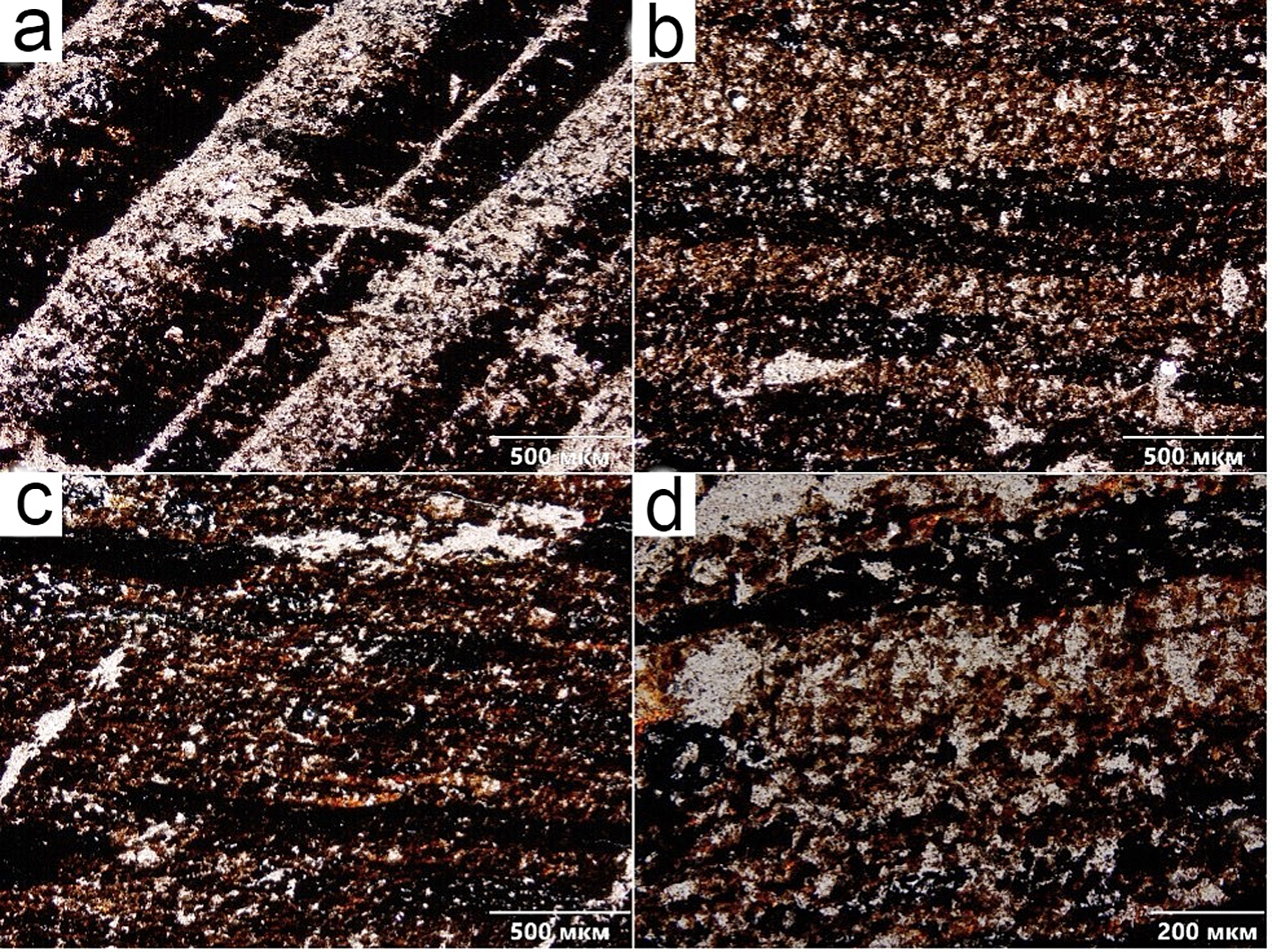 Анализ углесодержащих обломков показал, что они представлены углистыми и углисто-глинистыми породами. По форме компонентов выделяются полосчатые (рис. 2, a, b, d), волокнообразные и линзовидные (рис. 2, c) разновидности (Столбова, 2013). Цвет мацералов в основном чёрный, реже коричневый и тёмно-коричневый, что свидетельствует о высокой степени фюзенизации.