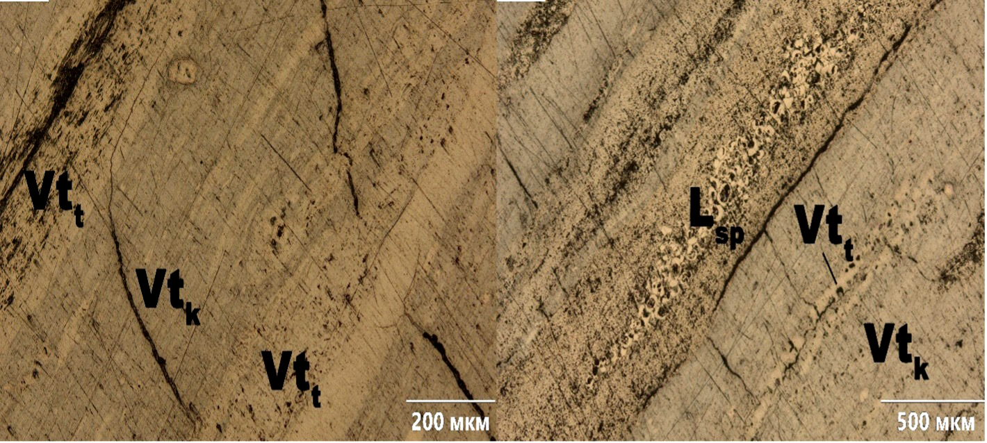 Рис. 3. Фрагмент (микрофотография) аншлиф-брикета: Vtt — телинит, Vtk — коллинит, Lsp — споринит. Отраженный свет, анализатор выключен