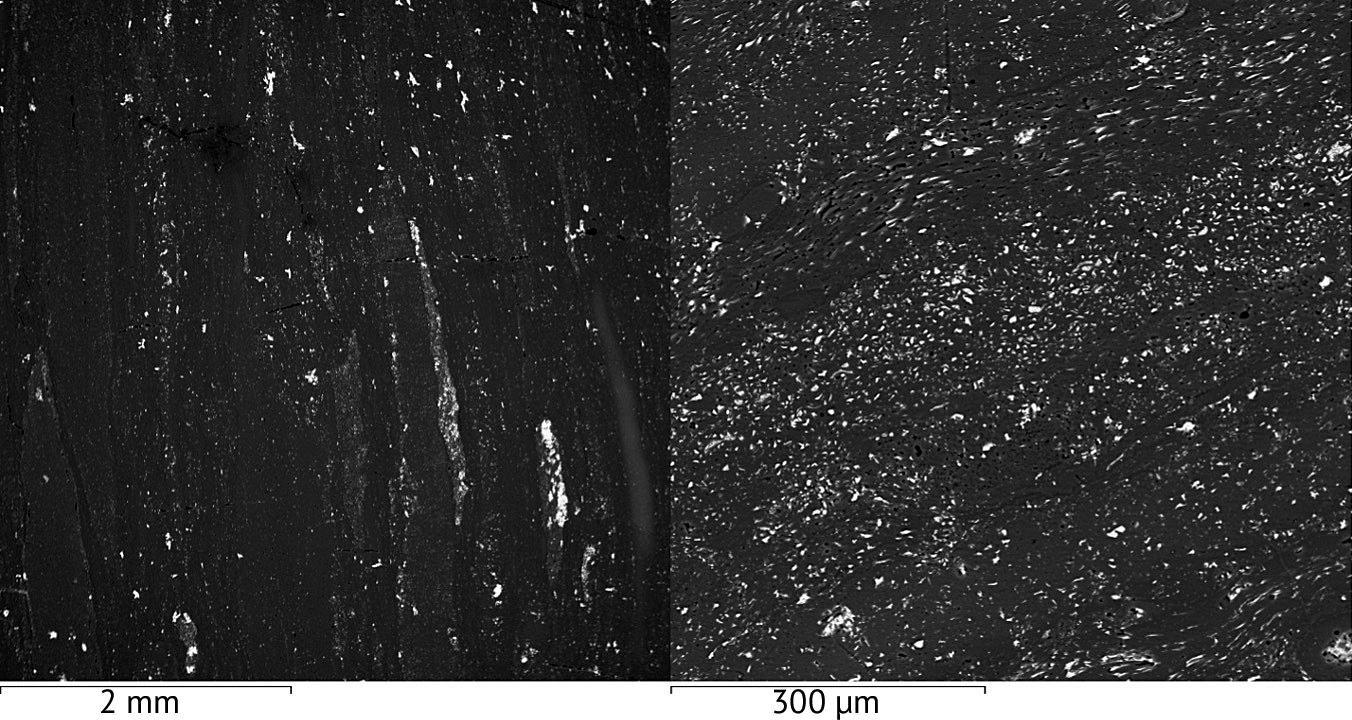 Рис. 5. Фрагменты аншлиф-брикета (микрофотографии). Белое и светло-серое — минеральная матрица, чёрное — уголь. Изображение в обратнорассеянных электронах