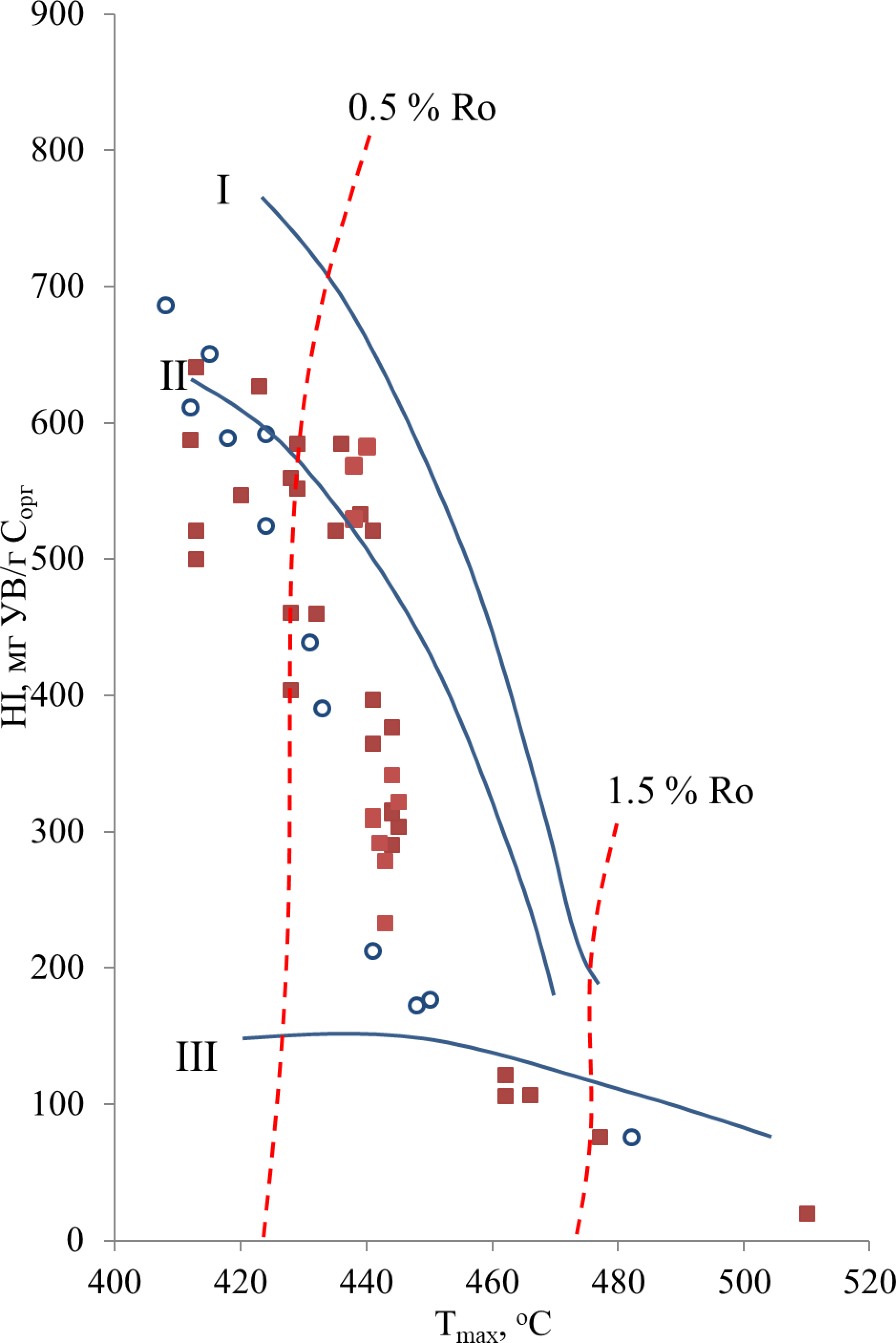 По данным пиролиза Rock-Eval, повышение температуры гидротермального эксперимента привело к увеличению значения показателя Tmax от 413 до 482 °С. Тренд экспериментальных изменений показателей Rock-Eval в гидротермальном эксперименте в основном соответствует тренду изменений органического вещества доманика при натуральном катагенезе (рис. 1).