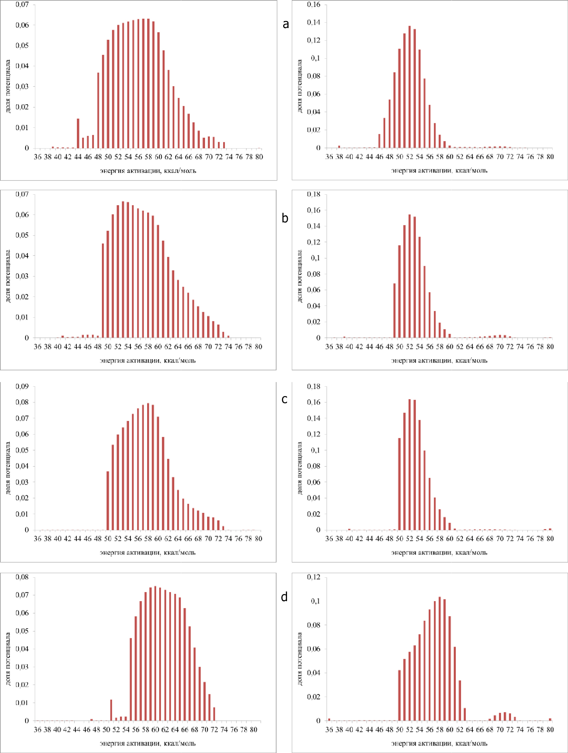 Рис. 3. Распределение начального потенциала образования н-бутана (левая колонка) и н-пентана (правая колонка) по шкале энергий активации при сухом ступенчатом пиролизе керогена до и после гидротермального воздействия: