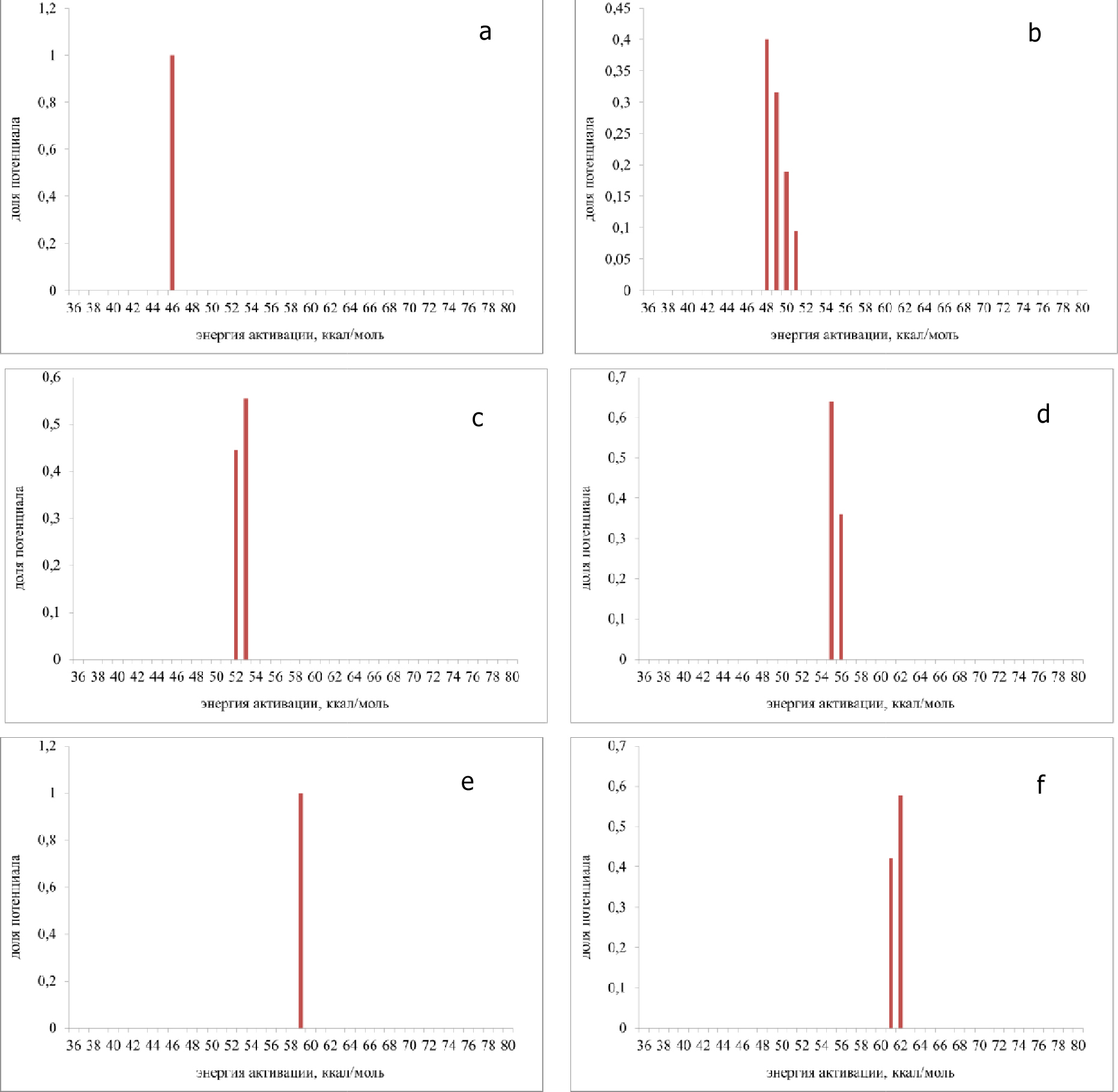 Сравнение кинетических спектров для гипотетического компонента, полностью образующегося при температуре 431 °С (рис. 4, a) или при 525 °С (рис. 4, c), показывает, что максимум распределения потенциала образования условного компонента в первом случае приходится на 46 ккал/моль, а во втором случае на 52—53 ккал/моль (рис. 4). Разница составляет 6—7 ккал/моль. Если условный продукт образовался при двух температурных ступенях — 431 и 525 °С — в равных долях ((рис. 4, b), то максимум распределения потенциала его образования соответствует уже 48—51 (49) ккал/моль. Разница со случаями образования 100 % гипотетического компонента составляет 3—4 ккал/моль. Для более высоких температур пиролиза разница положений рассчитанного максимума кинетического спектра сохраняется (рис. 4, a—f). Значит, представленные результаты расчёта для условного компонента позволяют оценить разрешение в определении распределения потенциала образования углеводорода по энергиям активации не хуже, чем 3—4 ккал/моль, что свидетельствует в пользу корректности сделанных на основе полученных экспериментальных данных выводов.