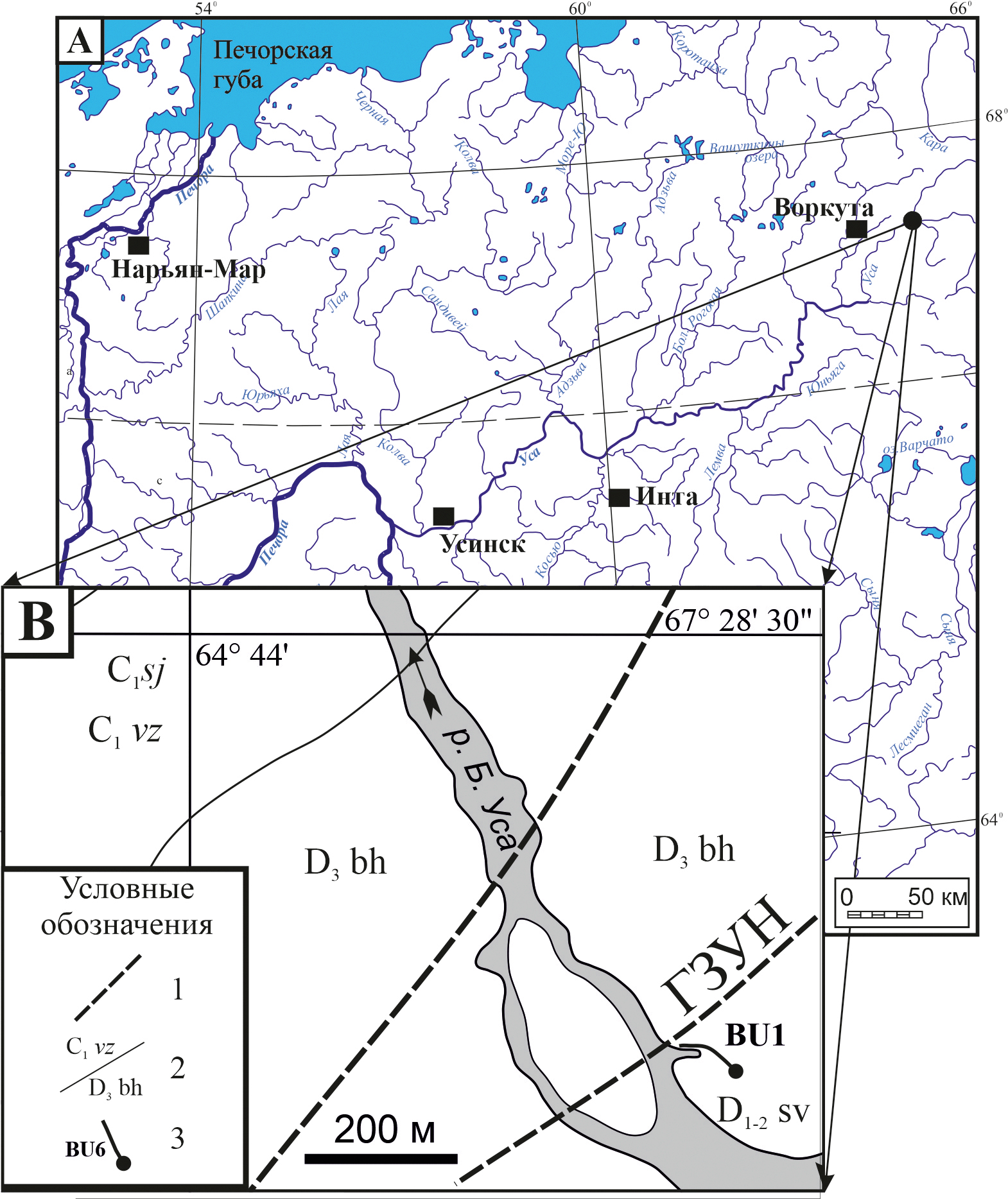 Рис. 1. Схемы расположения района исследования (а) и обнажения на р. Большая Уса (Полярный Урал) (b) (по: Журавлев, Плотицын и др., 2018). Условные обозначения: 1 — разрывные нарушения; 2 — геологические границы и индексы местных стратонов; 3 — обнажение Bu1