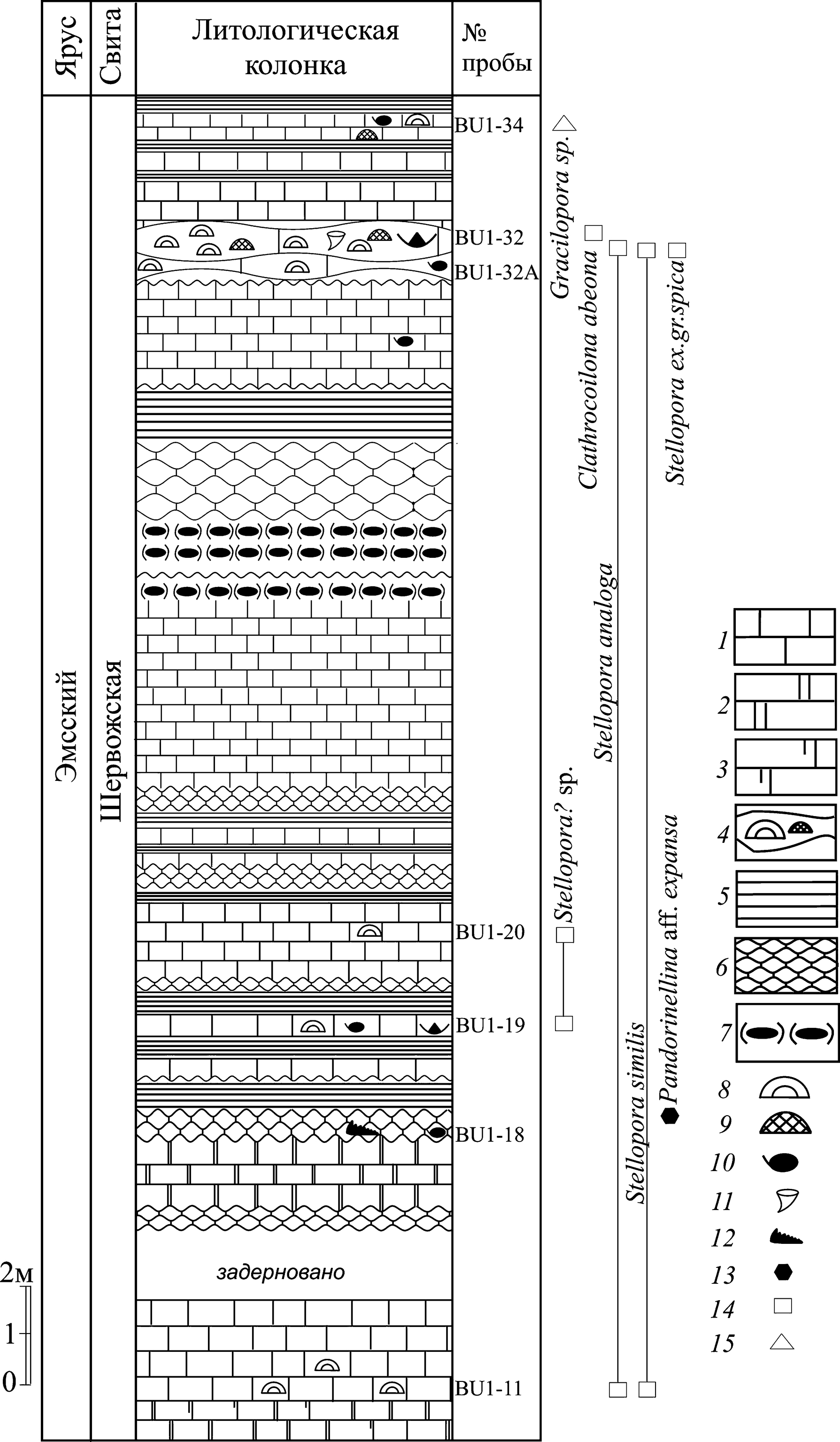 1 — известняк; 2 — доломит; 3 — доломитизированный известняк; 4 — биогенные кораллово-строматопоратовые известняки; 5 — аргиллиты; 6 — биоморфные известняки и доломиты; 7 — кремниевые стяжения; 8 — строматопороидеи; 9 — табуляты; 10 — остракоды; 11 — ругозы; 12 — конодонты; распространение таксонов: 13 — конодонты; 14 — строматопороидеи; 15 — кораллы