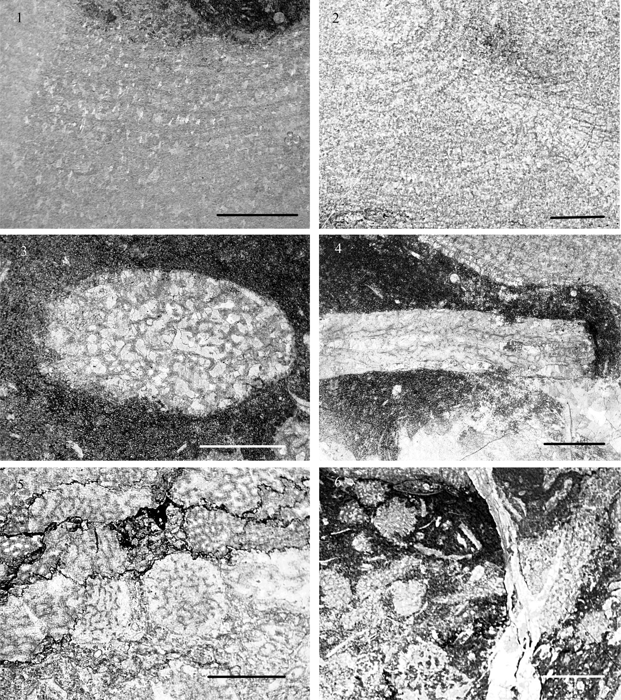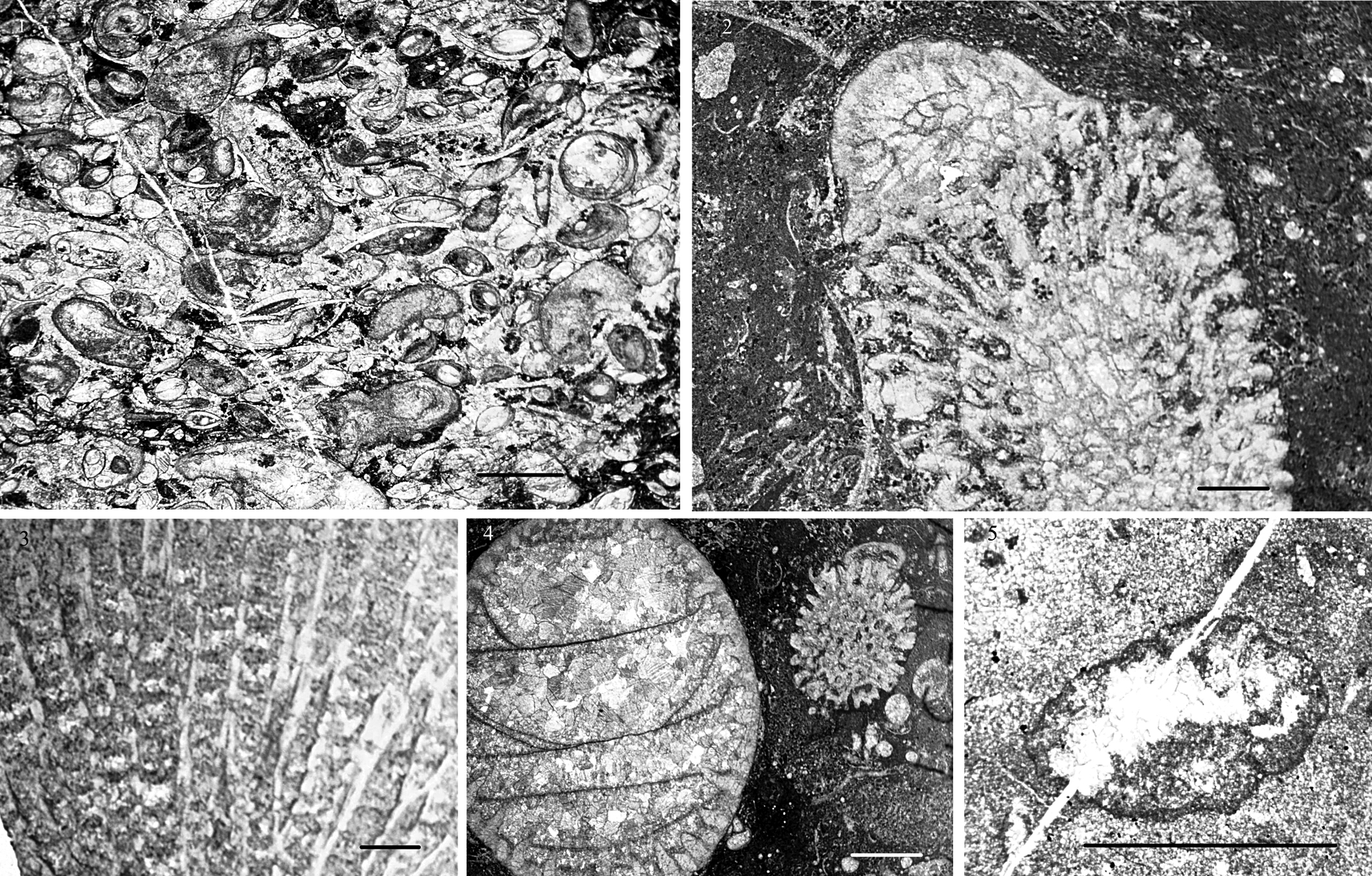 Породы содержат неравномерно распространенную по разрезу фауну строматопороидей, табулятоморфных кораллов (рис. 3, 2—4), ругоз (рис. 3, 4), остракод (рис. 3, 1), раковинный детрит и остатки цианобактерий (рис. 3, 5).