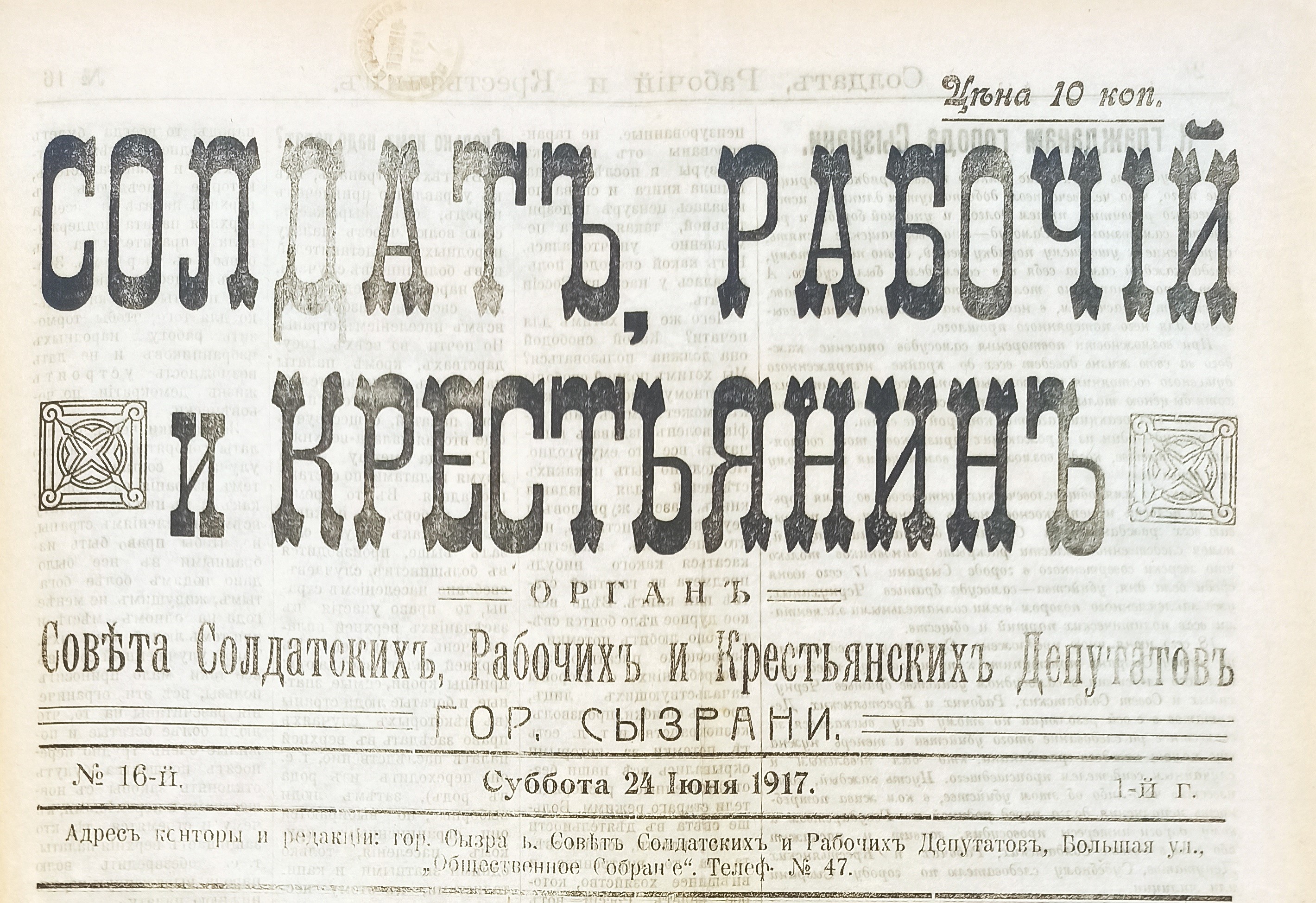 Ключевое положение в системе сызранской прессы периода революции и Гражданской войны занимали издания советов. С 1 мая Совет солдатских и рабочих депутатов г. Сызрани выпускал газету «Солдат и рабочий», которая печаталась в типографии Г.К. Васильева сначала три раза в неделю, а затем ежедневно. Редакция располагалась в конторе на Большой улице в доме Ильина (Общественного собрания). Уже в июне название газеты изменилось – «Солдат, рабочий и крестьянин» (ил. 1).
