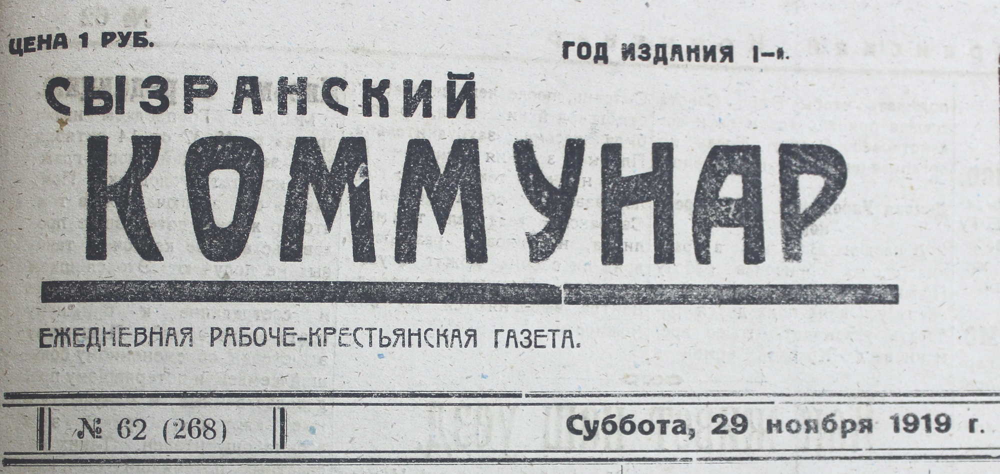 16 Новый орган // Известия Сызранского уездного и городского Советов и партии коммунистов. 1919. 7 марта (№ 52). С. 3.