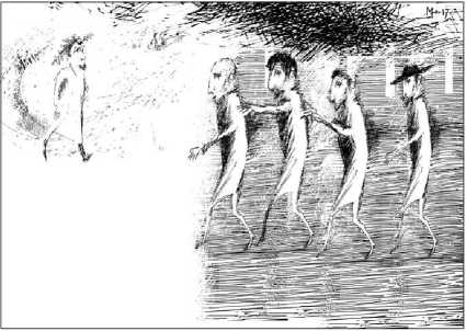 Меняясь от рисунка к рисунку, трансформируется характер персонажа, его образ мыслей, стремления: от отшельника-одиночки до человека, ритмично, подобно часовому механизму, единым строем шагающего в общей массе людей, как на листе «Дружно в ногу» (2017), не зная и не думая, куда и зачем. Художник не щадит своих персонажей, пишет их нарочито карикатурно, помещая в штриховую «тень» в противовес смелому одиночке, идущему «против течения» и на светлой стороне листа.