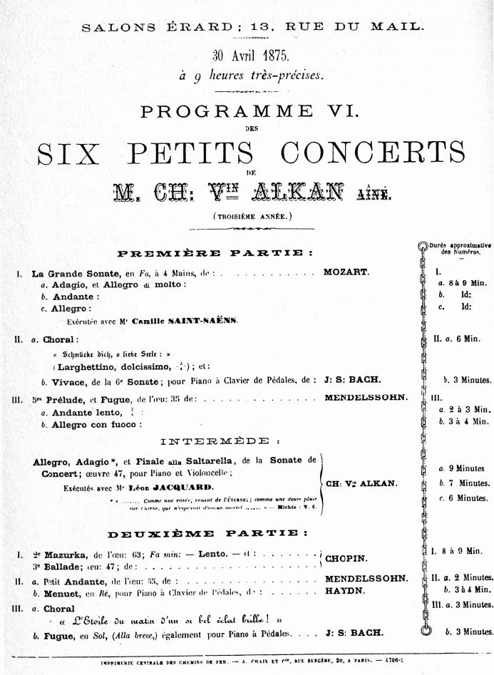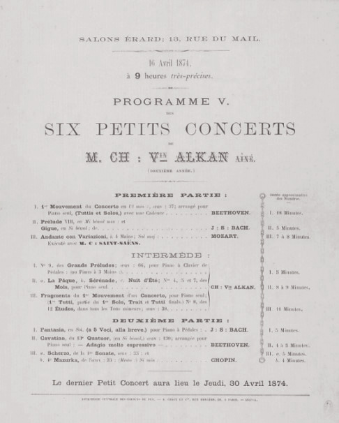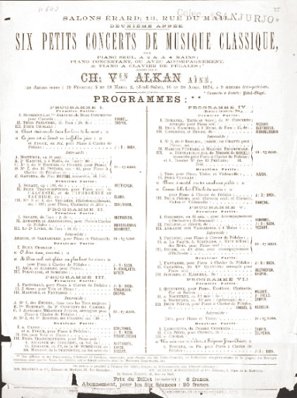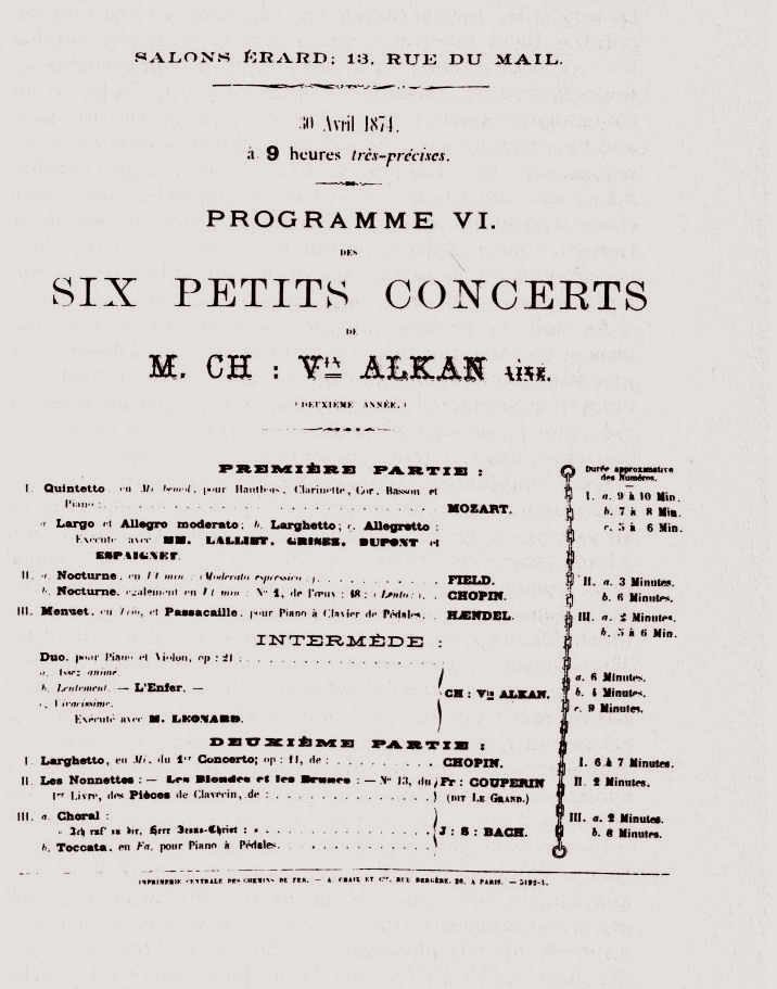 Музыкант проявил настоящий маркетинговый подход при устроении концертов. Задумывалась ежегодная серия из шести представлений (время проведения – с середины февраля по май). Сейчас, по прошествии всех сезонов, мы знаем, что не всё планируемое удавалось реализовать. Но в целом, за исключением 1876 г., сезоны продолжались до 1880 г.: в 1873 г. прошло пять концертов, в 1874 и 1875, 1877 гг. – по шесть, в 1878 г. – четыре. В 1879 г. «Маленькие концерты» не проводились из-за реконструкции в зале Эрара (о чем рецензент RGM высказал сожаление), но Алькан участвовал в концертах официальной серии камерной музыки: 28 июня13 (в сотворчестве с Жакаром14 исполнил Виолончельный дуэт ор. 47 собственного сочинения) и 19 июля (выступал с произведениями для педальера). В 1880 г. Алькан сократил количество концертов до трех.
