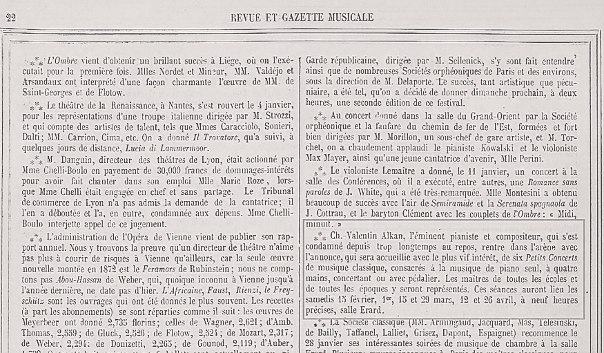 Ил. 8. Анонс о начале концертов Алькана в Revue et Gazette Musicale de Paris. Vol. 40, № 3 (19 янв. 1873). P. 22