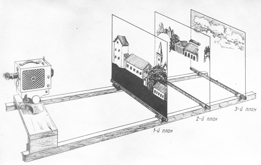 На горизонтальных станках производится и многоплановая дорисовка. Основная сущность этого метода состоит в том, что объектом дорисовки служит не один рисунок, как обычно, а целая серия их (2–3–4 и т. д.), располагаемых на стеклах параллельно один за другим согласно планам дорисовываемого изображения. Например, на первом плане дается вырезанное и наклеенное на стекло изображение архитектурного сооружения, на втором плане – лес, на третьем – медленно движущиеся (от мотора с червячным ходом) рисованные облака.