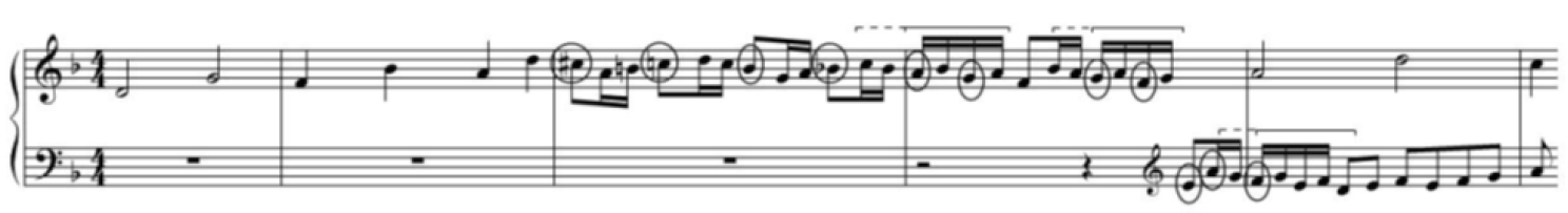 Редуцируя первый элемент баховской темы с характерной для него барочной фигурой circulatio (круг), композитор демонстрирует один из типов движения, который встречается в тематизме фуг И.С. Баха и состоит из последовательности восходящих кварт (символ бодрости, по Б.Л. Яворскому), изложенных от устойчивых ступеней. Один из подобных примеров – тема фуги из малого цикла Токката и фуга d-moll («Дорийская», BWV 538), в которой, однако, квартовые скачки являются ямбическими, тогда как в теме фуги Римского-Корсакова – хореическими (на чередовании ямбических и хореических восходящих кварт основана тема фуги А-dur из I тома «Хорошо темперированного клавира»).