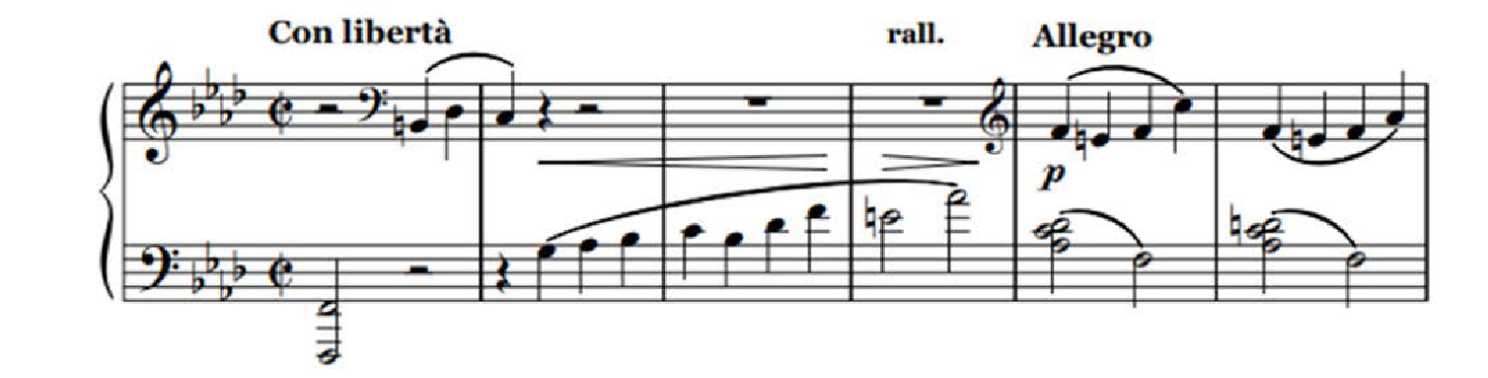 Возвращение к репризе подготавливается двутактовым предыктом, новым пятидольным метром и фантазийным кружевом шестнадцатых рояля, на фоне которых вновь звучит первая тема альта (пример 11). Сурдина помогает создать далекий и ирреальный образ прошедшего времени, мечту, исчезающую в тающих альтовых флажолетах и прозрачных гармониях фортепиано.