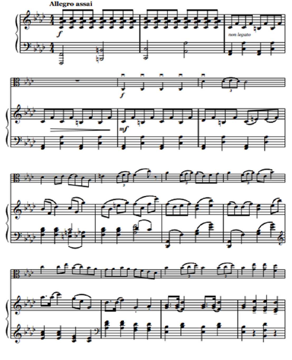 Финал Сонаты (Allegro assai) – летящий и порывистый. Теме альта (f-moll) предшествует короткое фортепианное вступление, состоящее из активных гармонических аккордов и восходящих октавных басов, очерчивающих диапазон от «фа» большой октавы и «ля бемоля» в малой – разложенной децимы, образованной чередованием малых терций и секст (пример 12). На этом фоне ярко и настойчиво проявляются варьированные повторы, широкие интервальные ходы и остинатные ритмы, создающие динамичную и масштабную картину всего действия.