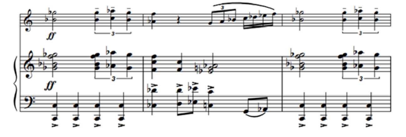 Такой гимнический настрой создается при помощи нарочитой акцентировки мелодических линий, подчеркнутого и многократного повторения определенных ритмоформул (пример 7) и, конечно, яркой динамической краски. При этом рисунок ансамблевой фактуры воспринимается достаточно строго и графично, с четко выверенными функциями каждого инструмента.
