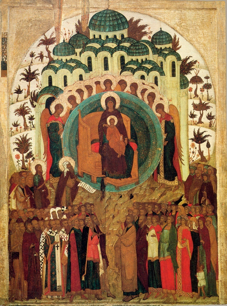 Расположение святых относительно друг друга нетрадиционно: святитель Николай изображен с левой стороны. В композиционном решении передается диалог между святыми. Их лики слегка повернуты друг к другу, что придает жанровость сюжету. Святитель Николай облачен в синюю ризу и бордовую фелонь, на плечах – белый омофор с золотыми крестами. В руках чудотворец держит большое Евангелие, украшенное золотой разделкой. Мученица написана в светлой тунике, сине-зеленой столе, подпоясанной узорным поясом и темно-пурпурном плаще, который застегнут на фибулу по центру. Такой вид одежды указывает на высокий статус женщины в период поздней Античности [21, с. 337]. Вариант изображения в костюме, указывающем на статус высокопоставленных особ, присутствует в иконописи Древней Руси. Он представлен в иконе круга Дионисия «О Тебе радуется» XVI в. и ряде византийских икон (рис. 4). Можно предположить, что в этом отражается ориентир иконописца конца XIX – начала ХХ в. на византийские и древнерусские иконографические традиции. На голове царицы белый плат и зубчатая корона, характерная больше для культуры балканских и западноевропейских стран. В левой руке она держит пальмовую ветвь – символ победы и императорского величия, широко распространенный в культуре Древнего Востока и Античности [22, с. 101].