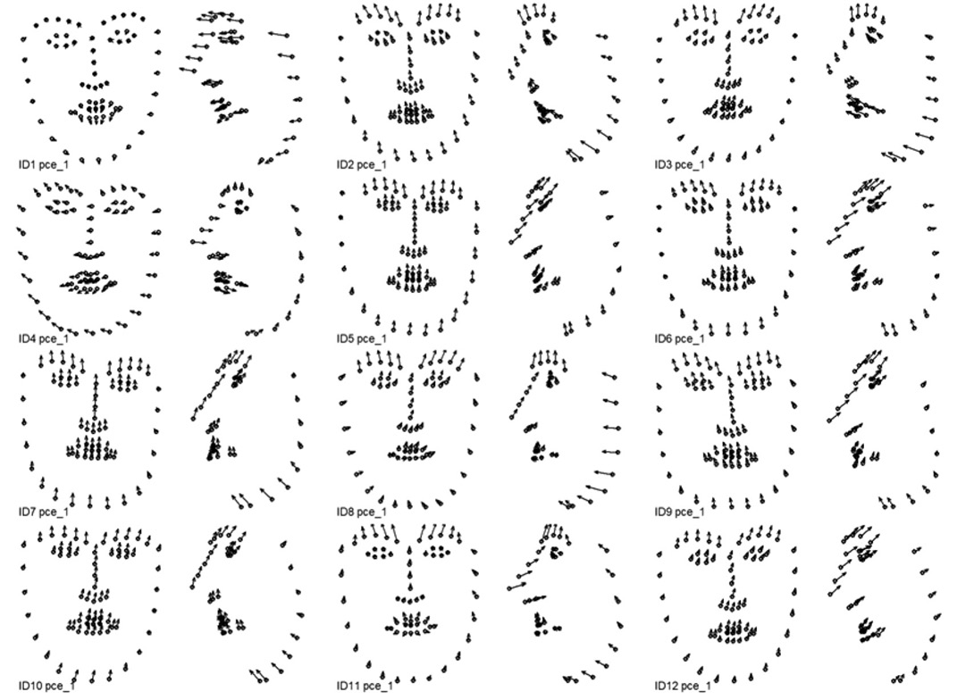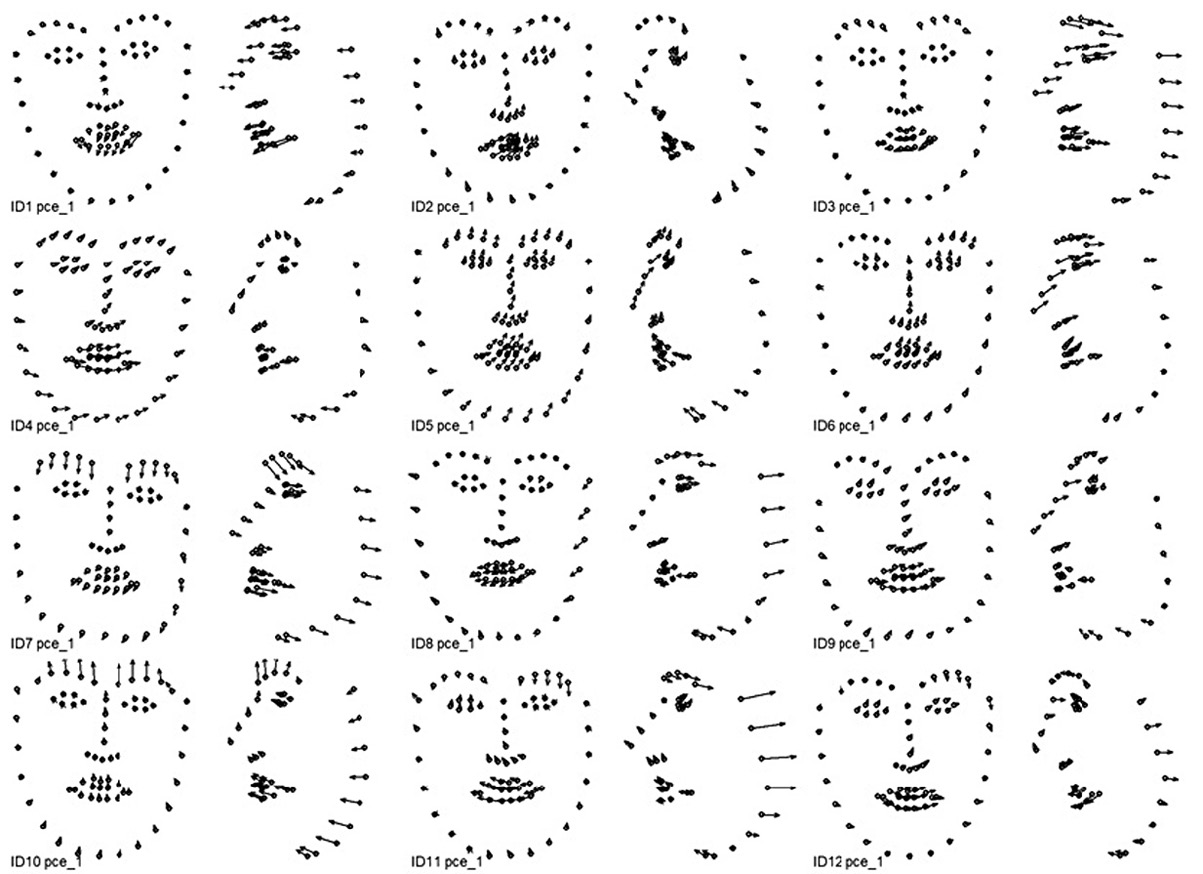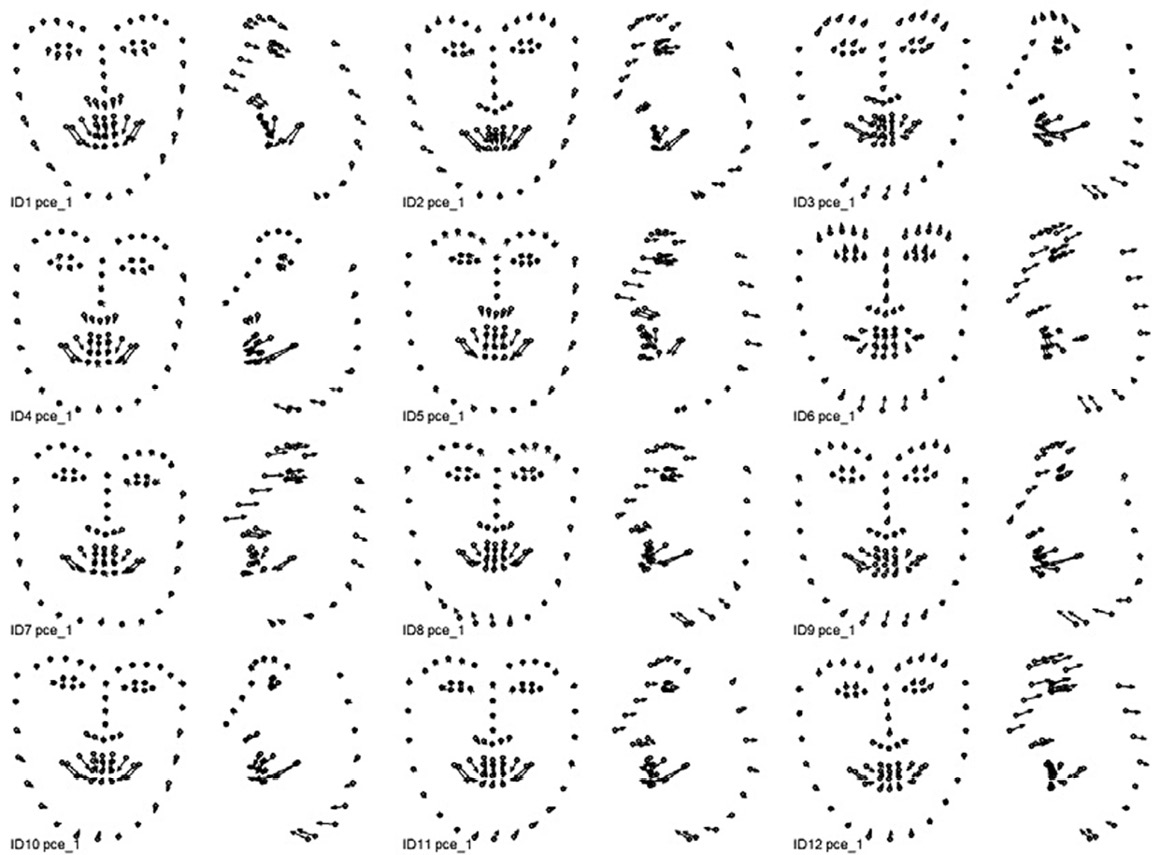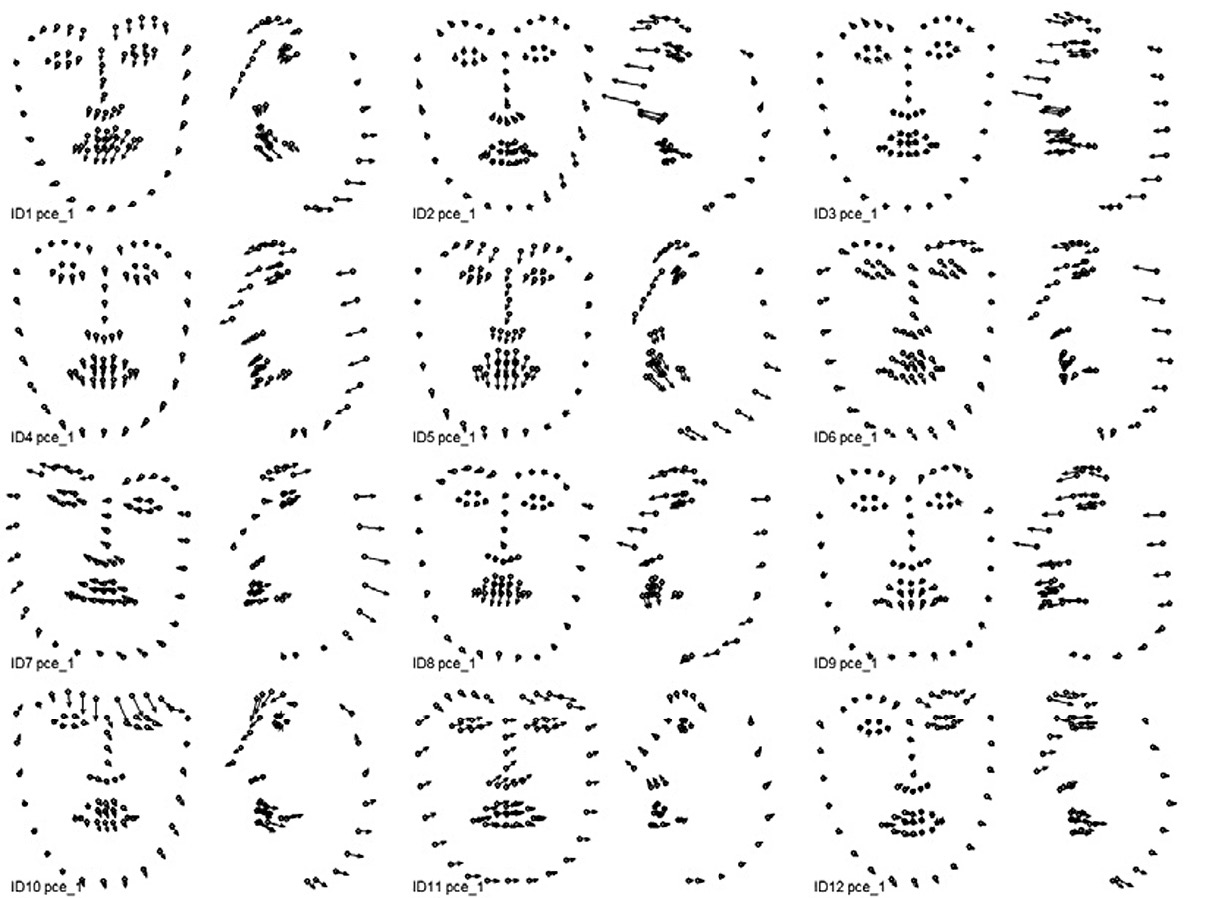 Поиск индивидуальных комплексных динамических паттернов, связанных с выражением соответствующей эмоциональной экспрессии, выполняется с помощью анализа главных компонент раздельно для каждой из 12 видеозаписей, обработанных OpenFace. Входными показателями анализа главных компонент являются соответствующие наборы данных 3D координат 68 ключевых точек. По результатам анализа для каждой эмпирической главной компоненты вычисляются: