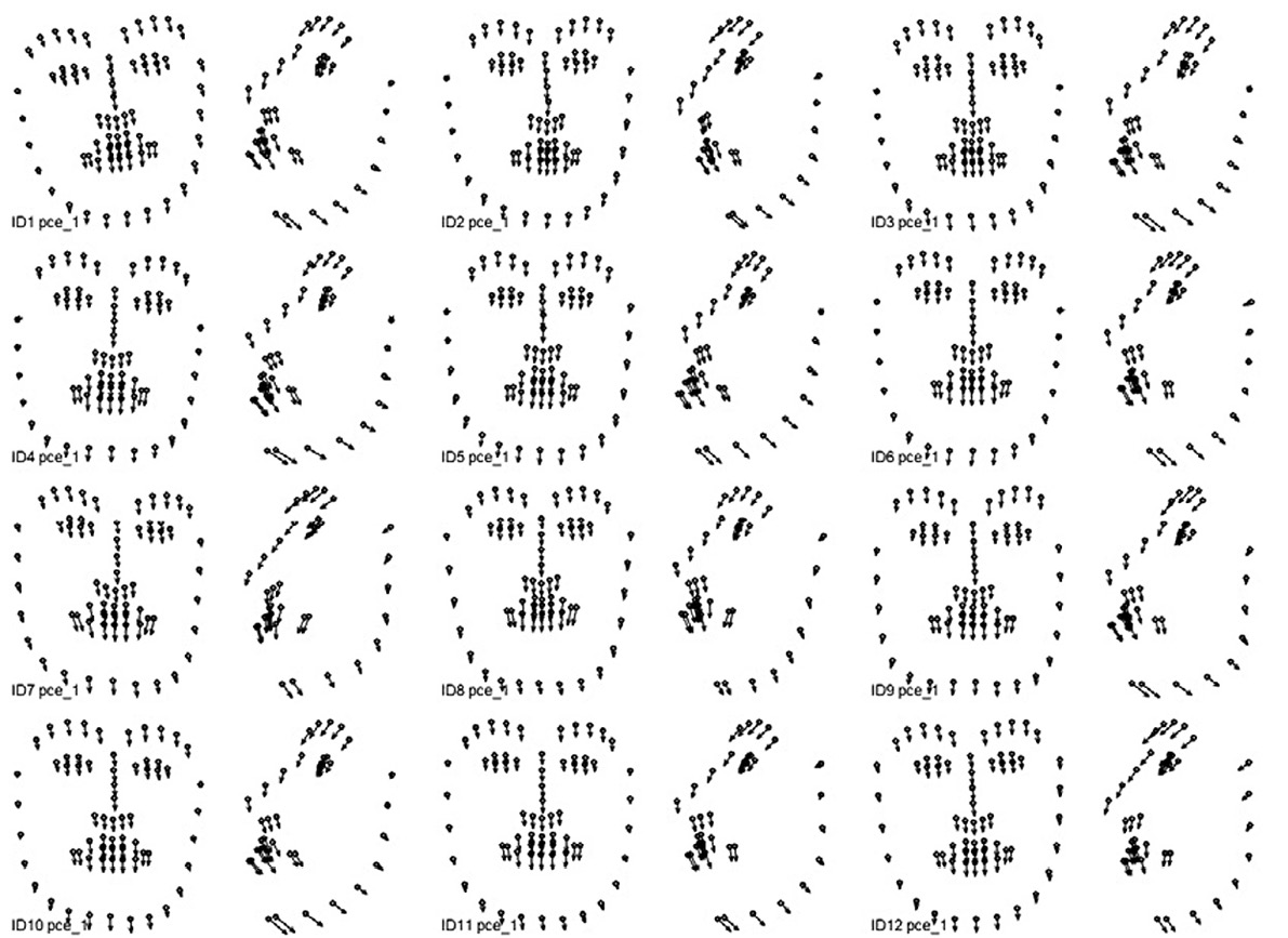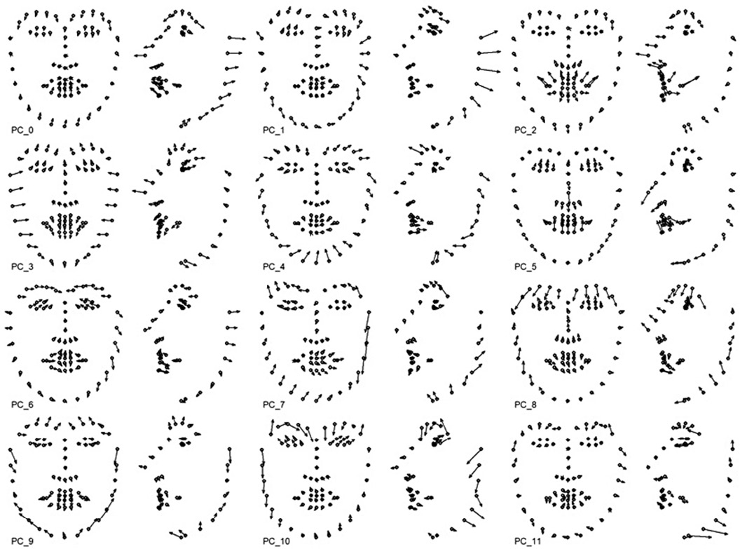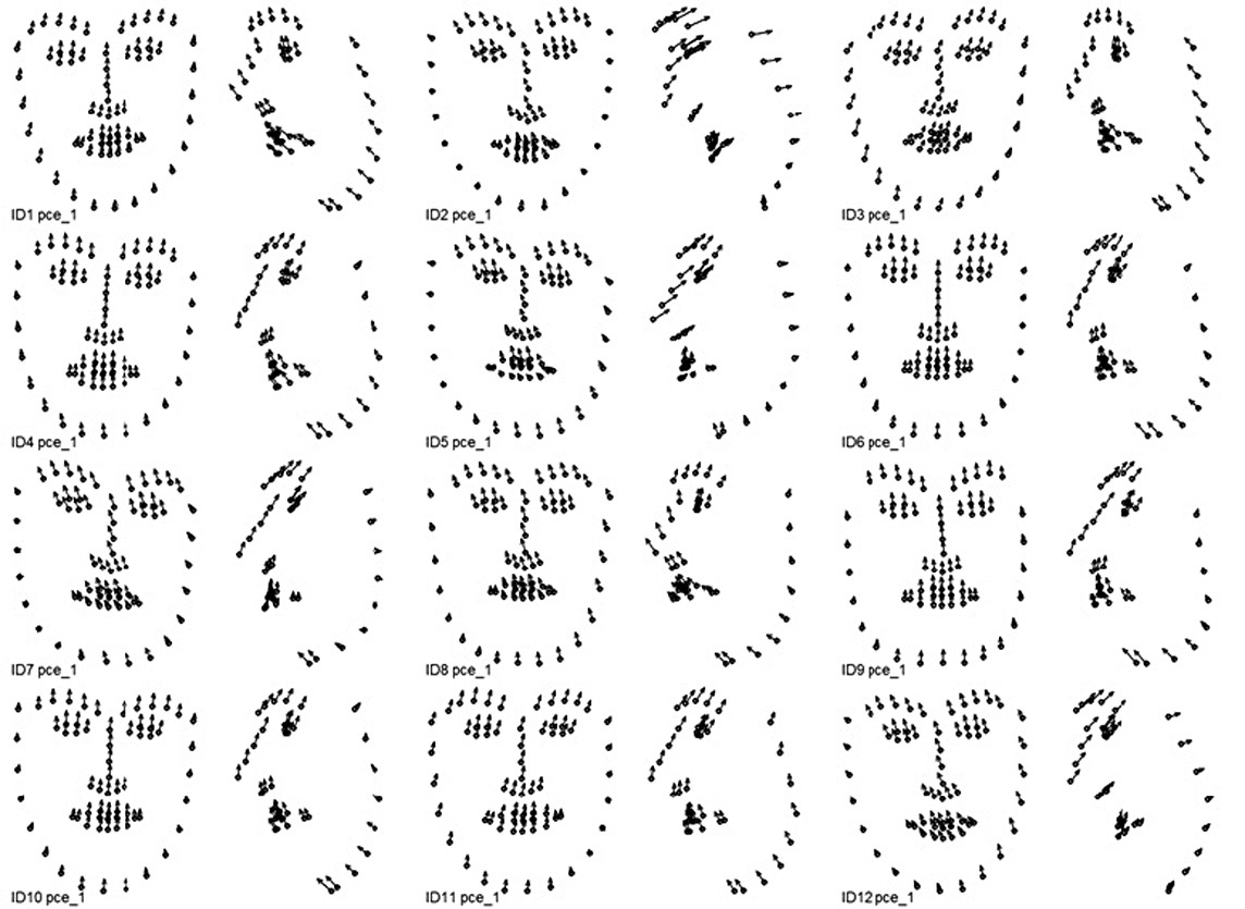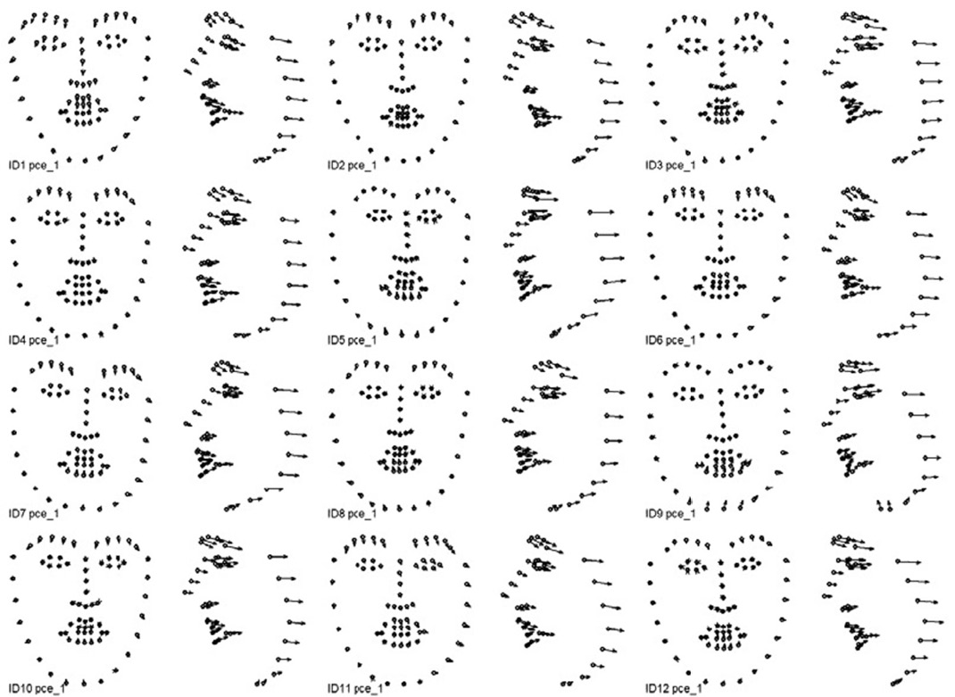 Поиск индивидуальных комплексных динамических паттернов, связанных с выражением соответствующей эмоциональной экспрессии, выполняется с помощью анализа главных компонент раздельно для каждой из 12 видеозаписей, обработанных OpenFace. Входными показателями анализа главных компонент являются соответствующие наборы данных 3D координат 68 ключевых точек. По результатам анализа для каждой эмпирической главной компоненты вычисляются: