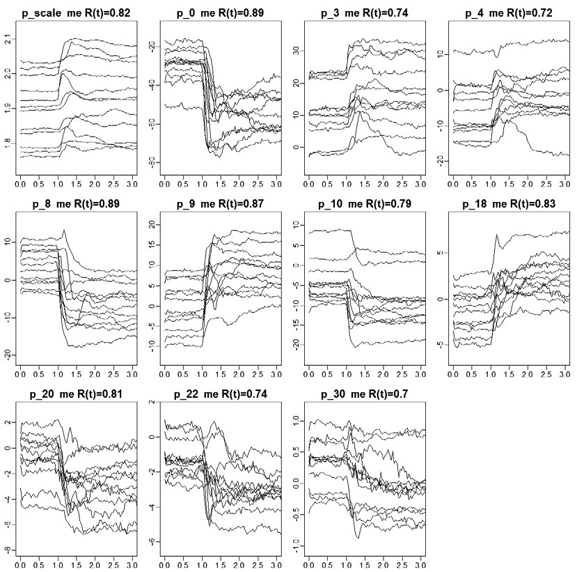 Рис. 4. Временная развертка подстроечных параметров PDM (экспрессия страха). Примечание: По горизонтали время от 0 до 3 сек. По вертикали – величина подстроечного параметра.
