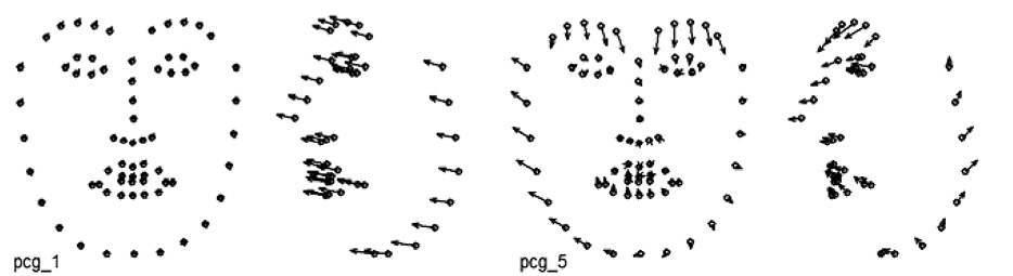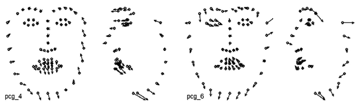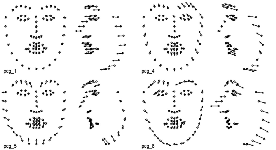 Другой вариант – проведение анализа главных компонент на основе ранее полученного набора координат ключевых точек, при котором часть компонент «зафиксирована» и отражает характерные мимические паттерны, связанные с набором AU, предположительно присутствующих в анализируемой мимике.