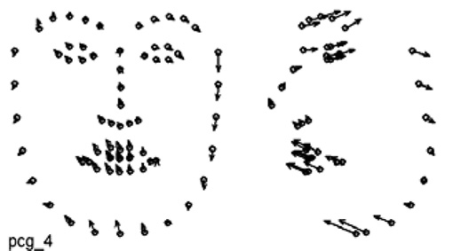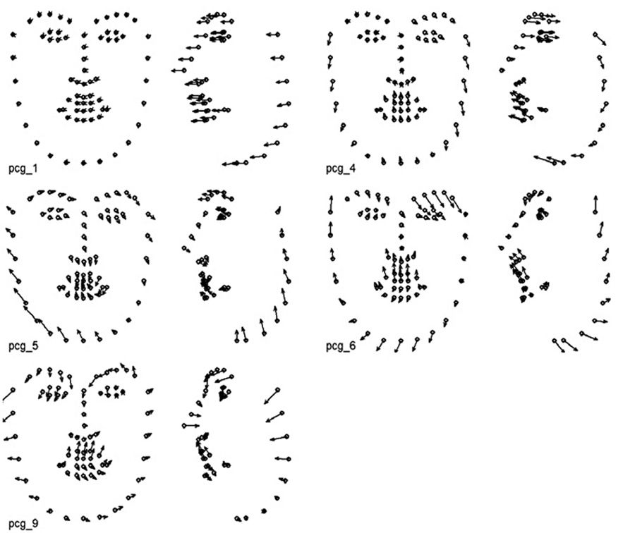 На уровне анализа обобщенных главных компонентов целостный динамический паттерн содержит от одной до 5-ти главных компонент. Содержательный анализ вклада каждой из компонент требует решения дополнительной задачи: выполнение парциальных реконструкций динамики лица, описываемых комбинацией заданных главных компонентов.
