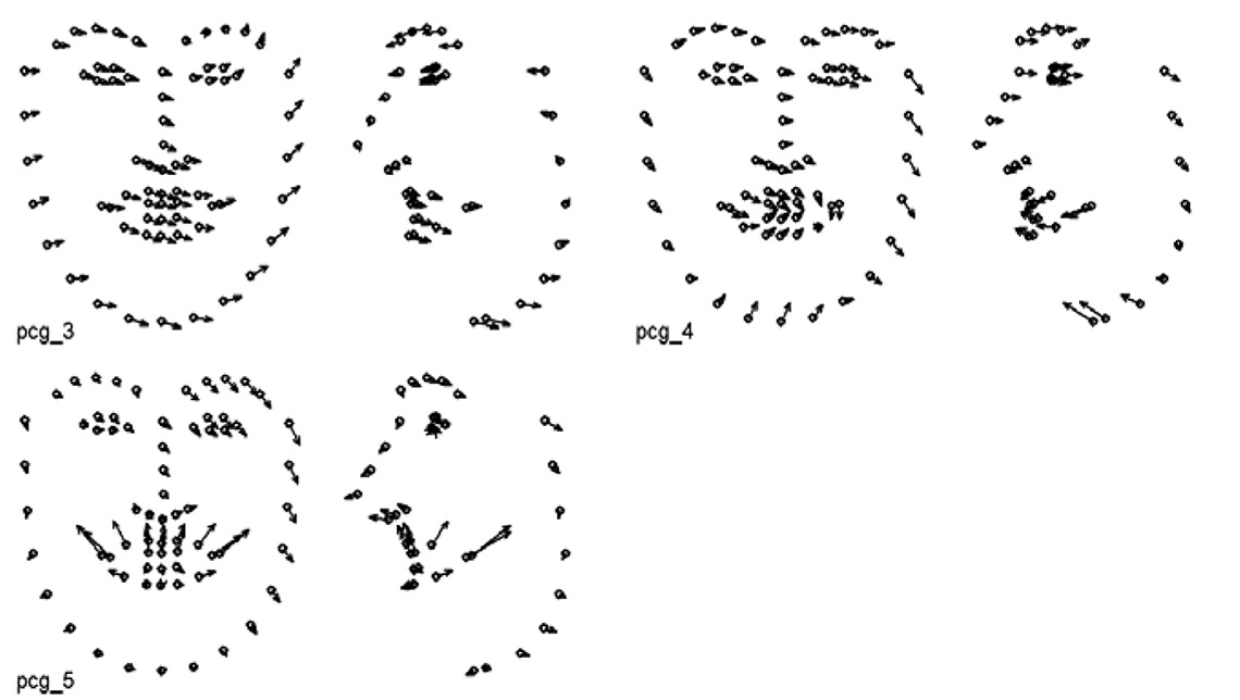 Возможное решение описанной проблемы состоит в определении функционала каждой из AU как комплексного изменения координат всех ключевых точек. В таком случае теоретически возможна смена «базиса», т.е. Point Distribution Model будет опираться не на формально полученные и трудно содержательно интерпретируемые NRSP (см. Рис. 1, 2, 3), а на физиологически обоснованные AU, соответствующие сокращению отдельных мышц лица. В таком случае модель детекции ключевых точек получила бы содержательное физиологическое основание, при этом вклад каждой AU мог бы быть вычислен непосредственно в ходе подгонки модели. При этом получил бы естественное обоснование вопрос о полноте системы используемых AU.