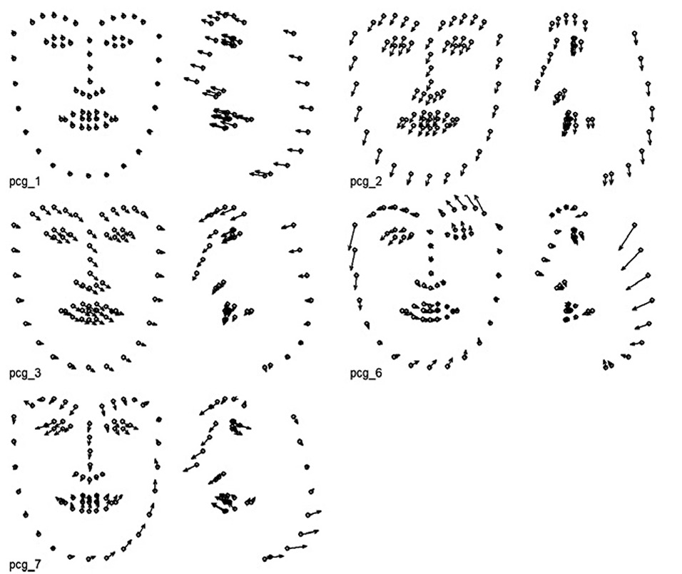Рис. 7. Пространственная реконструкция первой главной компоненты для 12 наборов данных (экспрессия страха). Примечание: Показаны средние значения координат ключевых точек и направления изменения их положения. Длина стрелок соответствует весу соответствующего параметра +80. Рисунок демонстрирует вариативность первой главной компоненты для включенных в анализ наборов данных.