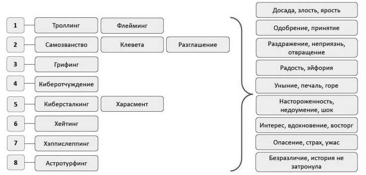 Существует множество форм кибербуллинга (троллинг, флейминг, киберталкинг, разглашение конфиденциальной информации, самозванство, секстинг, хейтинг, киберотчуждение, хэппислепинг, клевета, харасмент, грифинг, астротурфинг) с разной степенью интенсивности и способом влияния на психику человека.