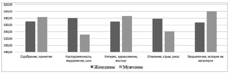 Мужчины в целом чаще, чем женщины, оценивают ситуации кибербуллинга через группы эмоций: одобрение, принятие; интерес; вдохновение, восторг; безразличие, история не затронула.